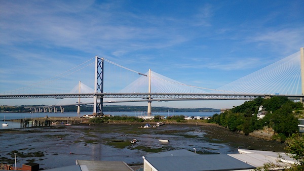 De (spoor)brug ligt er naast 2 andere bruggen, nl de North Road Bridge waarover wij naar Edinburgh gefietst zijn en de nieuwe autostrade-brug 'Queensferry Crossing'.