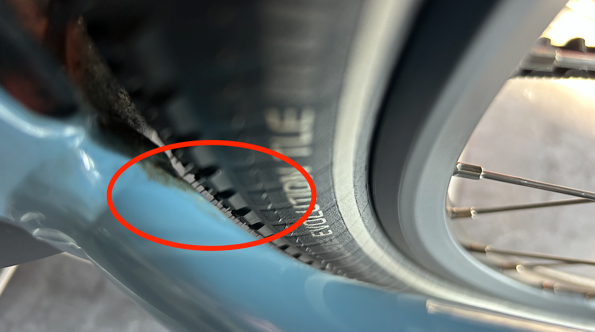 MAAR... we lopen tegen iets aan of beter gezegd: er loopt iets aan. De achterwielen zitten heel erg krap in de achtervork, er is maar zo'n 1-2 mm ruimte tussen band en achtervork. Bij volle bepakking, met wiel iets scheef of bij rijden op een modderige weg loopt dat (dus) nogal snel aan, heel irritant. Het wiel kan niet verder naar achteren want de Gates-riem staat al strak.