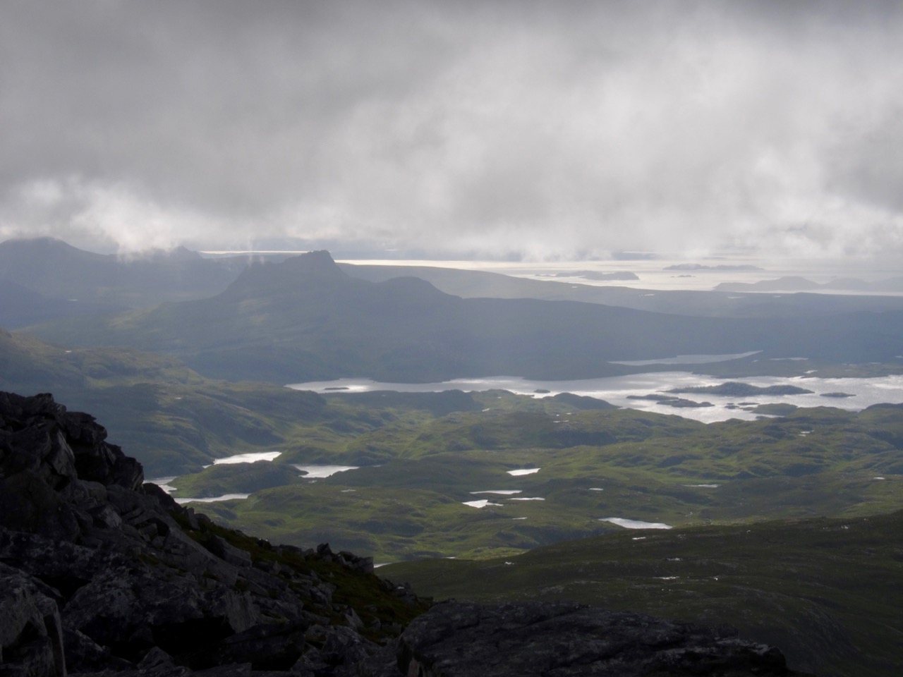 Qua weer is deze laatste foto veel meer representatief voor onze Schotland reis. We hebben de volledige beklimming van de Canisp in de regen en in de wolken gedaan. Gelukkig is het wolkendek even opengetrokken toen wij op de top stonden. Een Schotse wandelaar die een uur voor ons de top had gehaald was niet zo gelukkig: toen ik hem om het uitzicht vroeg sprak hij van een "Standard Scottish View" oftewel een grijze muur van wolken dus.