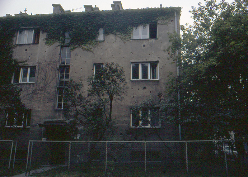 Nou zeg, zo vlug opgelost had ik nooit gedacht. Ik probeerde met die Russische letters qua taal-oppervlakte het zoekgebied groot te maken. De foto heb ik in 1981 gemaakt, nadat ik op vliegveld Okeçie (heet nu Frederic Chopin) ben geland en naar de Stare Miasto (oude stad) van Warschau heb gefietst. Met de foto, dé foto, waande ik me werkelijk in de Sovjet-Unie.... Het is een Russische oorlogsbegraafplaats halverwege de stad, want aan het eind van de oorlog is hier vreselijk gevochten, heel de stad lag in puin, met 850.000 doden alleen al in Warschau. Hier en daar zag ik nog huizen bezaaid met kogelgaten (zie foto onder). Alleen een stadswijk aan de overkant van de Wisła was redelijk ongeschonden.