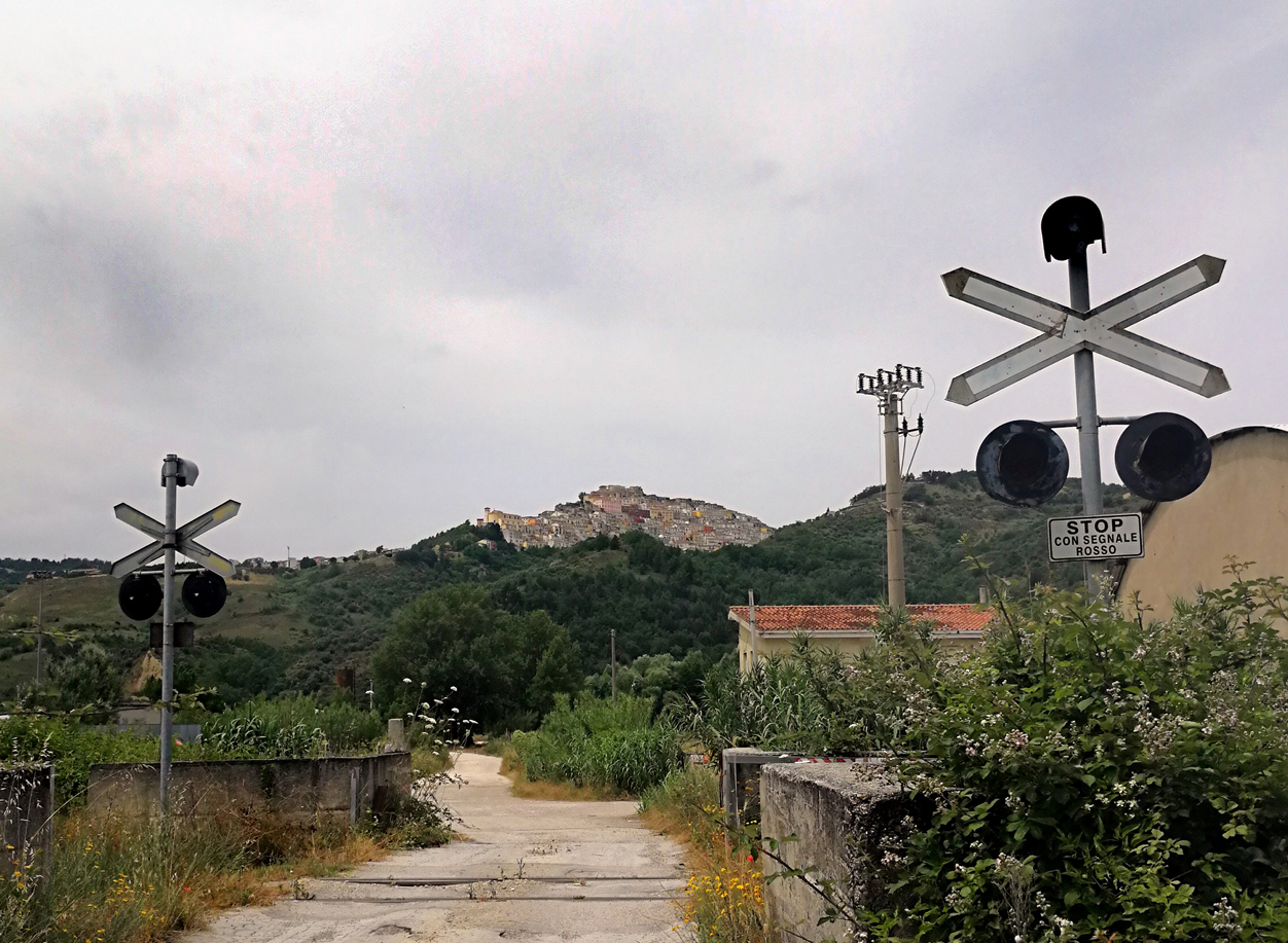 Het bord Stop con segnale rosso is in het Italiaans, maar daar zijn onzoekbare, ontelbare dorpen op heuveltoppen....