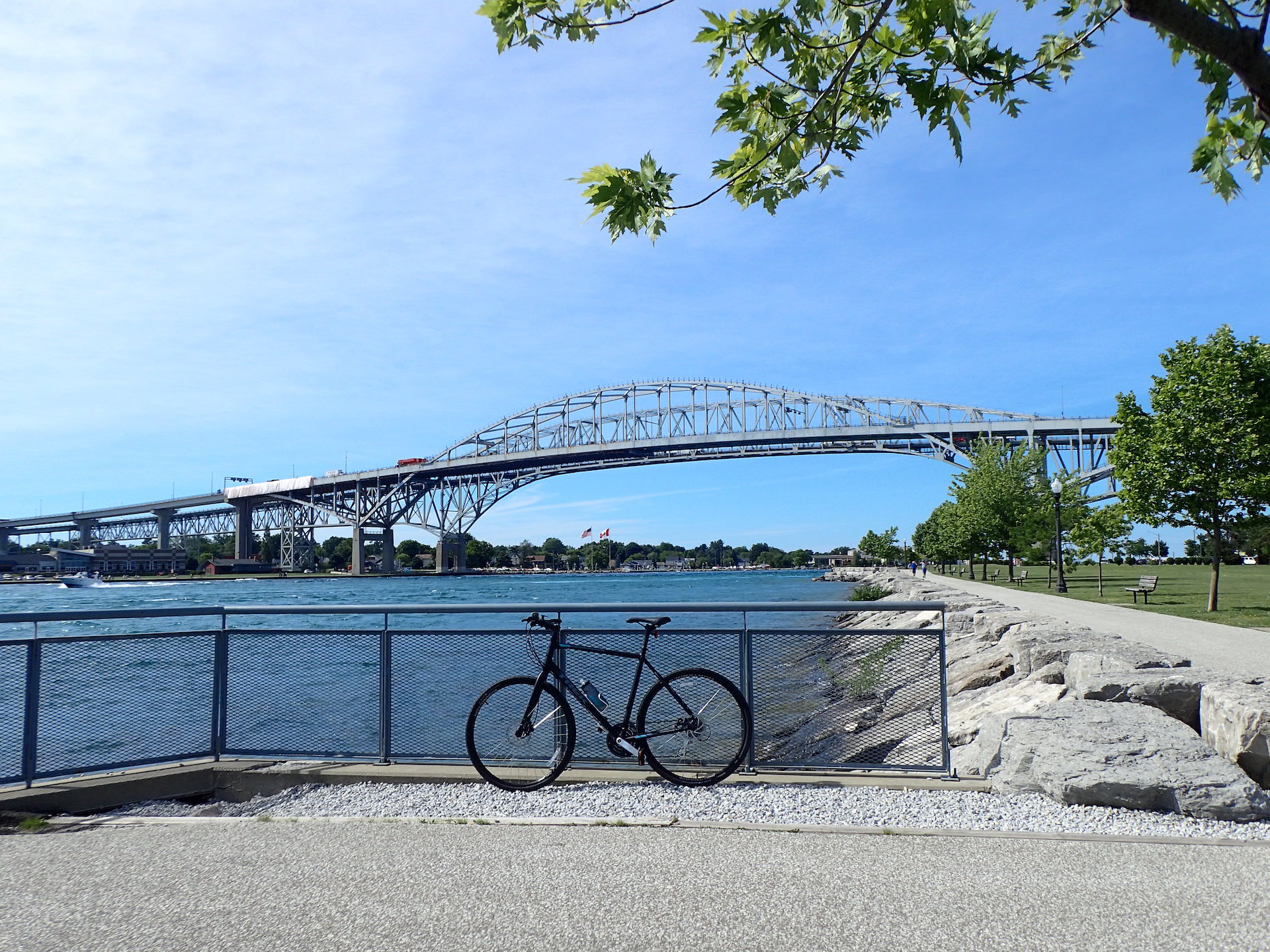 Tjemig, daar heb ik in 1982 nog over gefietst! :D Van Ontario naar Michigan. Maar toen was de andere brug ernaast nog niet. Helaas is het douanegebouw in de fraaie Art Deco-stijl uit 1938 aan de Amerikaanse kant nu gesloopt.... (volgens Streetview). Ik hoefde alleen maar mijn paspoort en visum te tonen en dan meteen doorgefietst, no problem! Enkel een vraag "Where are you going to?" Ik had die dag 167 km gefietst!