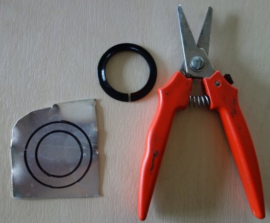 Eerst direct met deze FSA conus geprobeerd maar dat werkte niet, de vork liep tegen het framedeel aan. Toen ik met de schuifmaat de hoogte opmeten en zag dat de FSA conus ongeveer 1.2 mm lager was dan de originele conus. Ik had nog een stuk plaatstaal staan van ongeveer 1.2 mm dik dus daar met een schaar een ring van geknipt.
