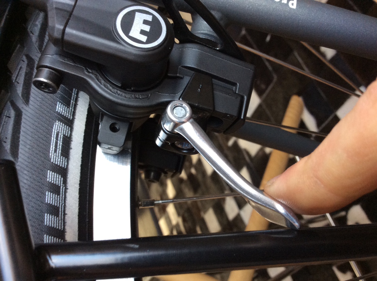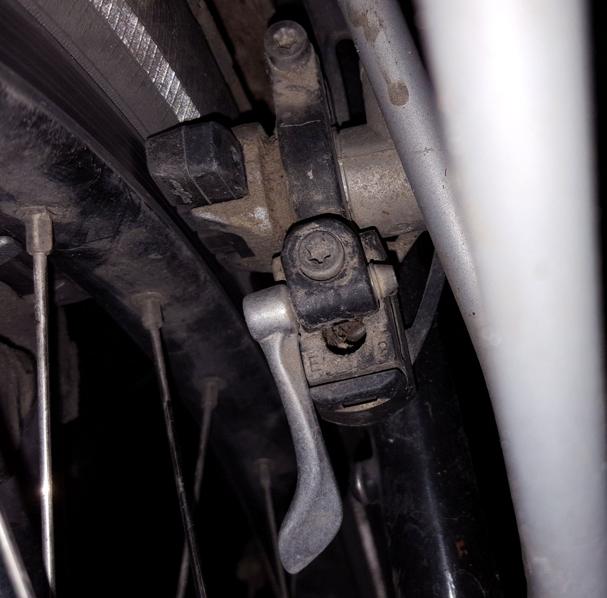 Hierbij een technische vraag, deze middag probeerde ik mijn nieuwe magura hs33 remmen te monteren op mijn frame. Nu is het onmogelijk om de snelsluiting te sluiten omdat de bagagedrager in de weg staat. Zie foto. De bagagedrager is een Tubus Logo Evo en het frame een vsf tx800. Mij lijkt voorlopig de enige oplossing de snelsluiter in te korten. Maar ik hoop dat iemand hier misschien een betere oplossing voor heeft.