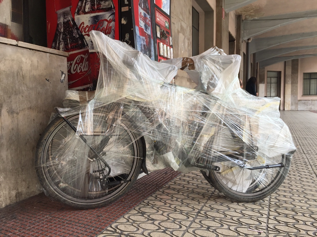 We hebben dus 3 rollen huishoudfolie gekocht en een rol tape (de supermarkt zit schuin tegenover het busstation. OP de reisdag een uurtje van te voren op het station en daar hebben we de trappers verwijderd, de sturen een kwartslag gedraaid en daarna de boel omwikkeld met huishoudfolie (veilig voor in de magnetron