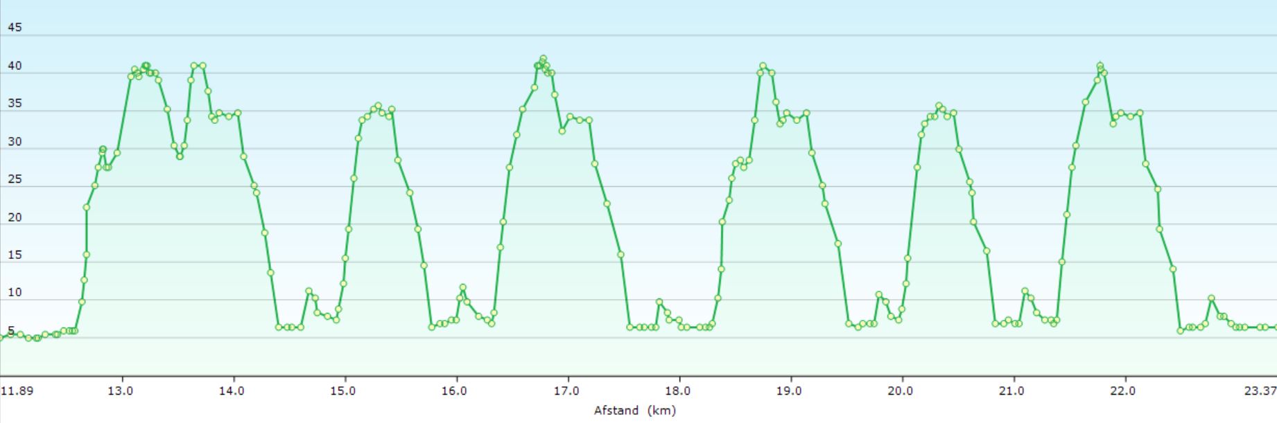 Ik heb drie keer naar boven gefietst, het eerste stuk 15% steil, daarna wat minder. Bij de tweede klim ging ik over de kasseienstrook. De keien waren gevat tussen het zand en op een gegeven moment raakte een kei los bij de aanraking van mijn voorwiel. Ik maakte een flinke smak maar gelukkig zonder kleerscheuren en mijn Focus mankeerde niets. De derde klim ging over dezelfde route als de eerste. Best pittig. Wel korter dan de Cauberg. Ideaal als oefenplaats om te klimmen voor Noord-Nederland!