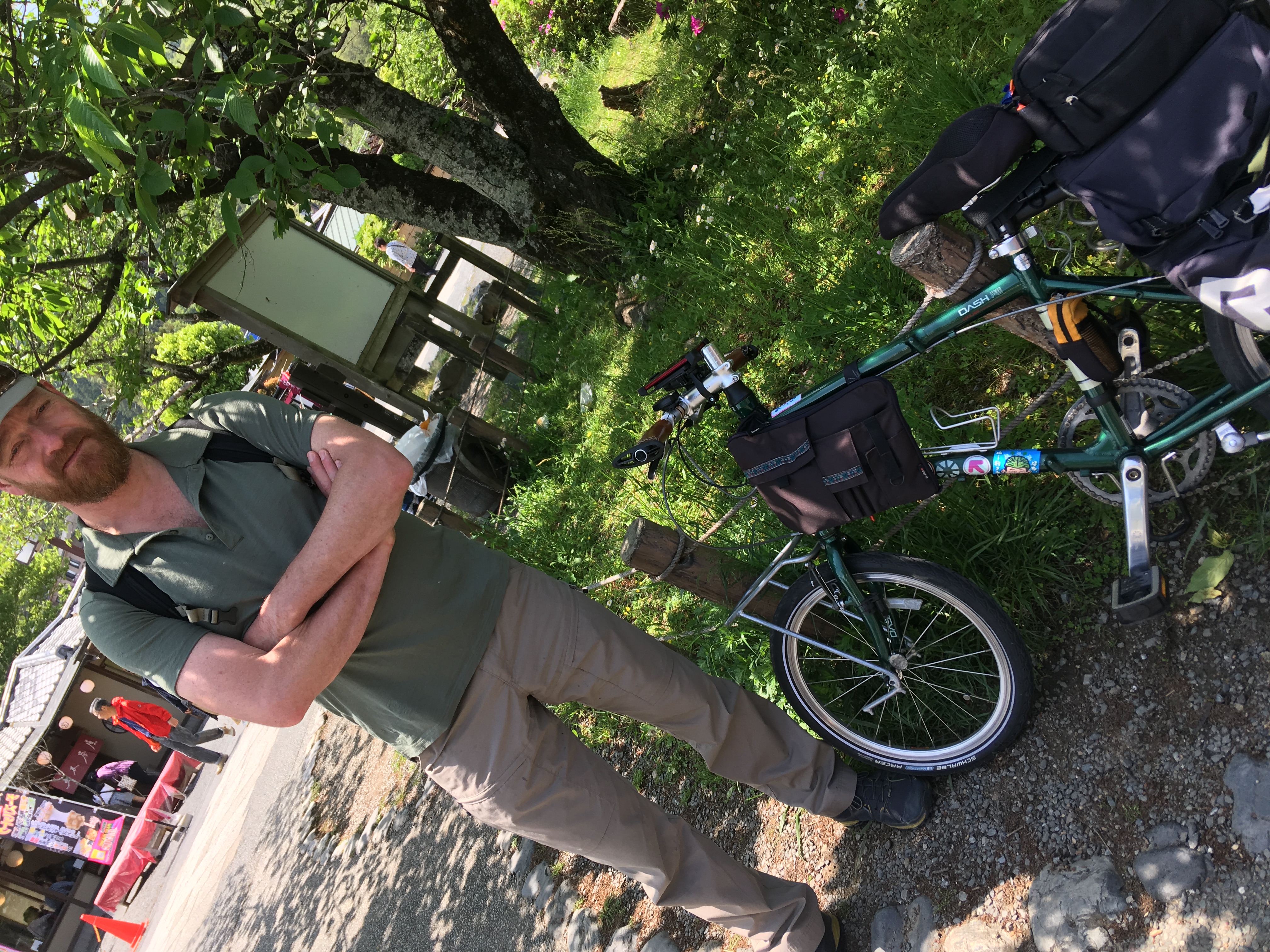 De foto is gemaakt met mijn mobiel. De man op de foto ben ik, inderdaad om de verhouding aan te geven. Naast mij een vakantiefiets van een Japanner. Ik ben momenteel in Japan en wilde dit bijzonder schattige exemplaar fiets delen met jullie. ( er ging helaas iets mis met verbinding) De fietsen hier in Japan zijn allemaal kindermaatjes. Ik ben 1.88 m dus niet extreem lang maar verhoudingsgewijs weer wel. Grappig aan deze fiets is dat bijna alles klein is, incl de tassen, wielen etc maar het crank stel weer niet. Ben benieuwd hoe dit fietst maar zal er nooit achter komen