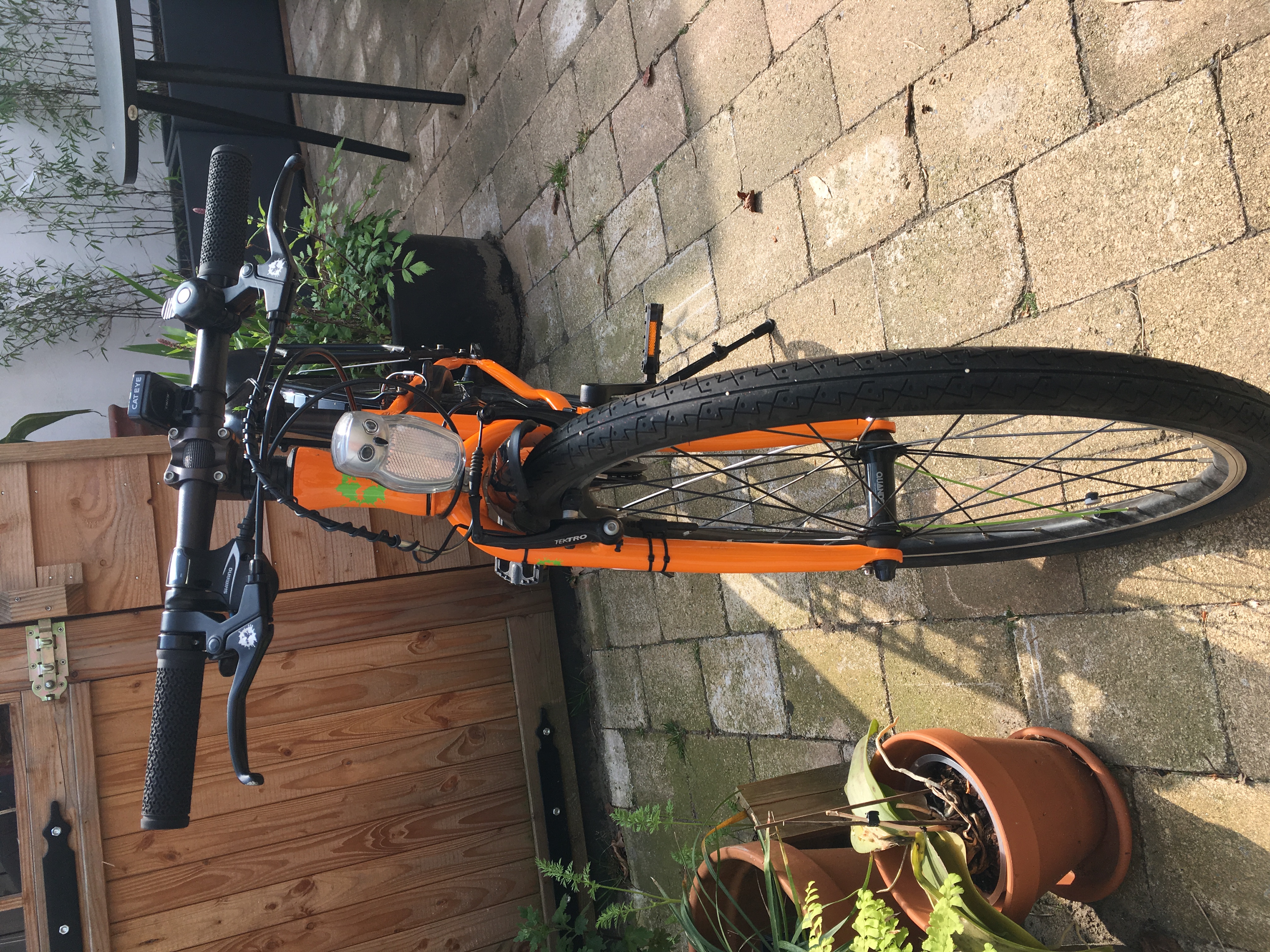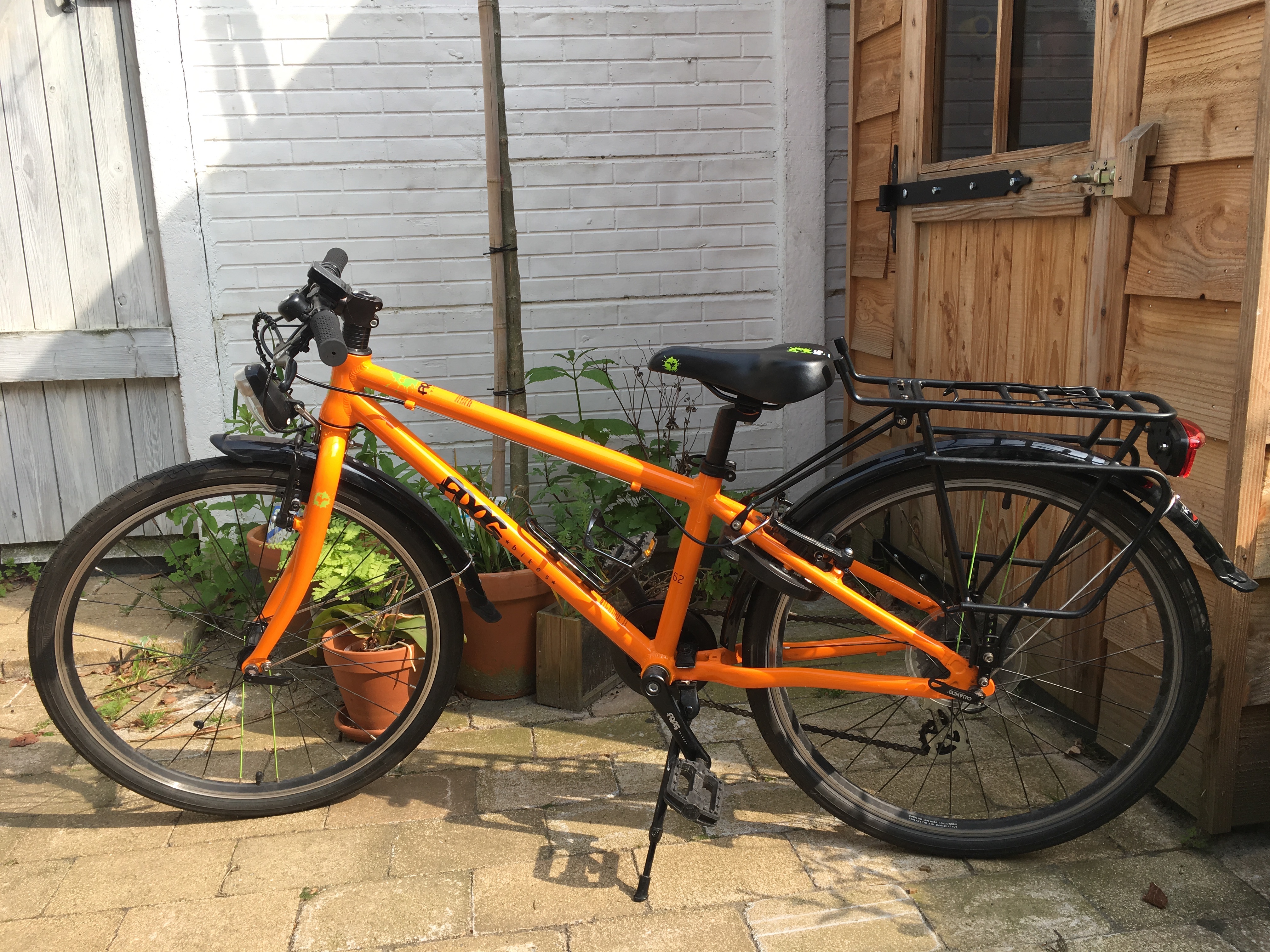 Onze dochter heeft er in totaal 394 km op gefietst, waaronder één fietsvakantie binnen Nederland. Verder heeft de fiets binnen gestaan. Mooie fietsvakantiefiets voor kinderen, maar voor onze dochter is-ie iets te sportief. Ze zit liever meer rechtop. Dus helaas moeten we op zoek naar iets anders. De fiets heeft met alle accessoires € 490,00 gekost. De originele aankoopbon (met Serviceplan) krijg je erbij.