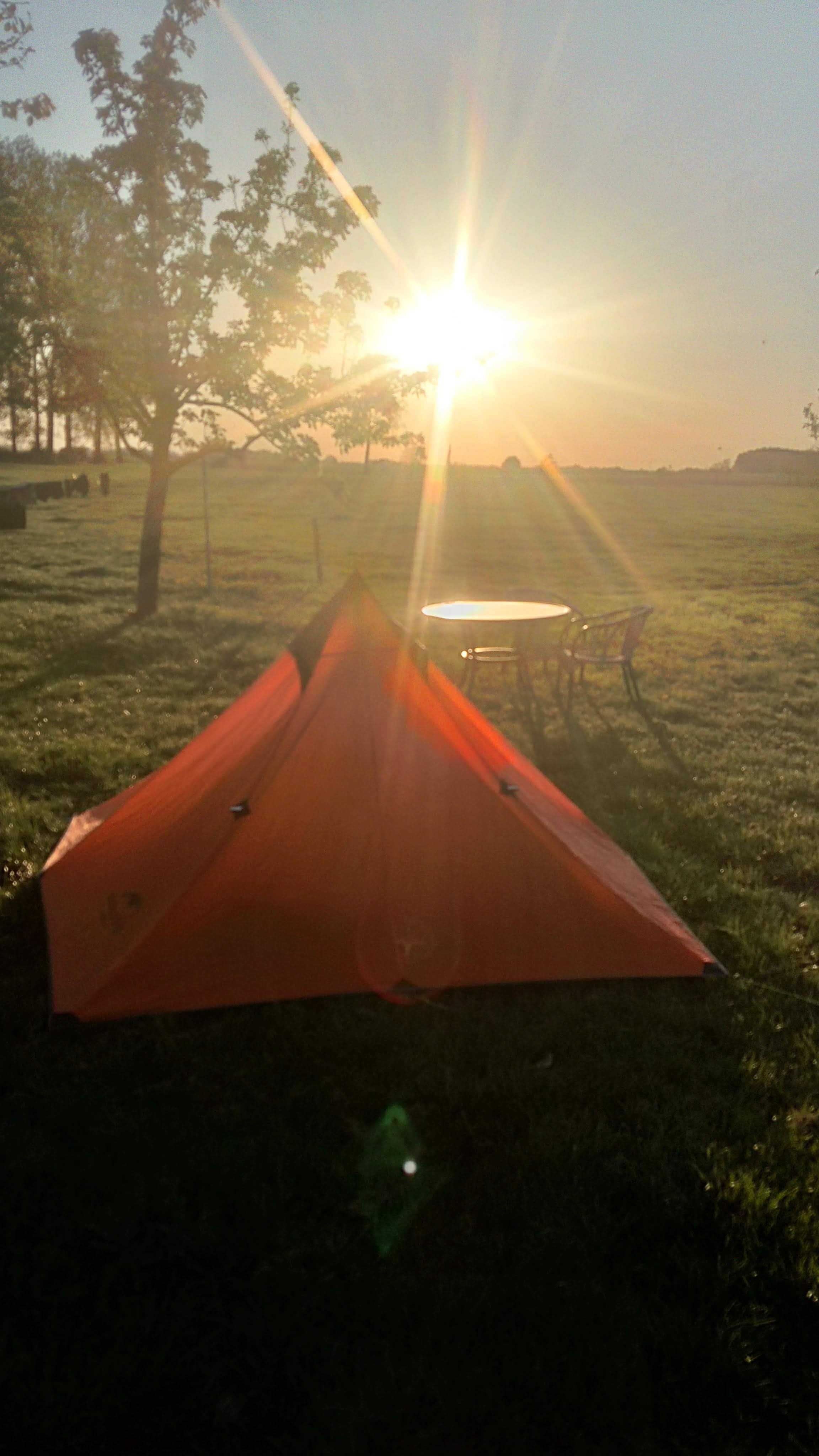 Ik verkoop de tent met grondzeil, binnentent van mesh, buitentent, aluminium haringen en trekking pole die in het midden staat. Waar je overigens geen last van hebt omdat de ritsvakken goed geplaatst zijn. Alles in totaal weegt 1,8 kg.