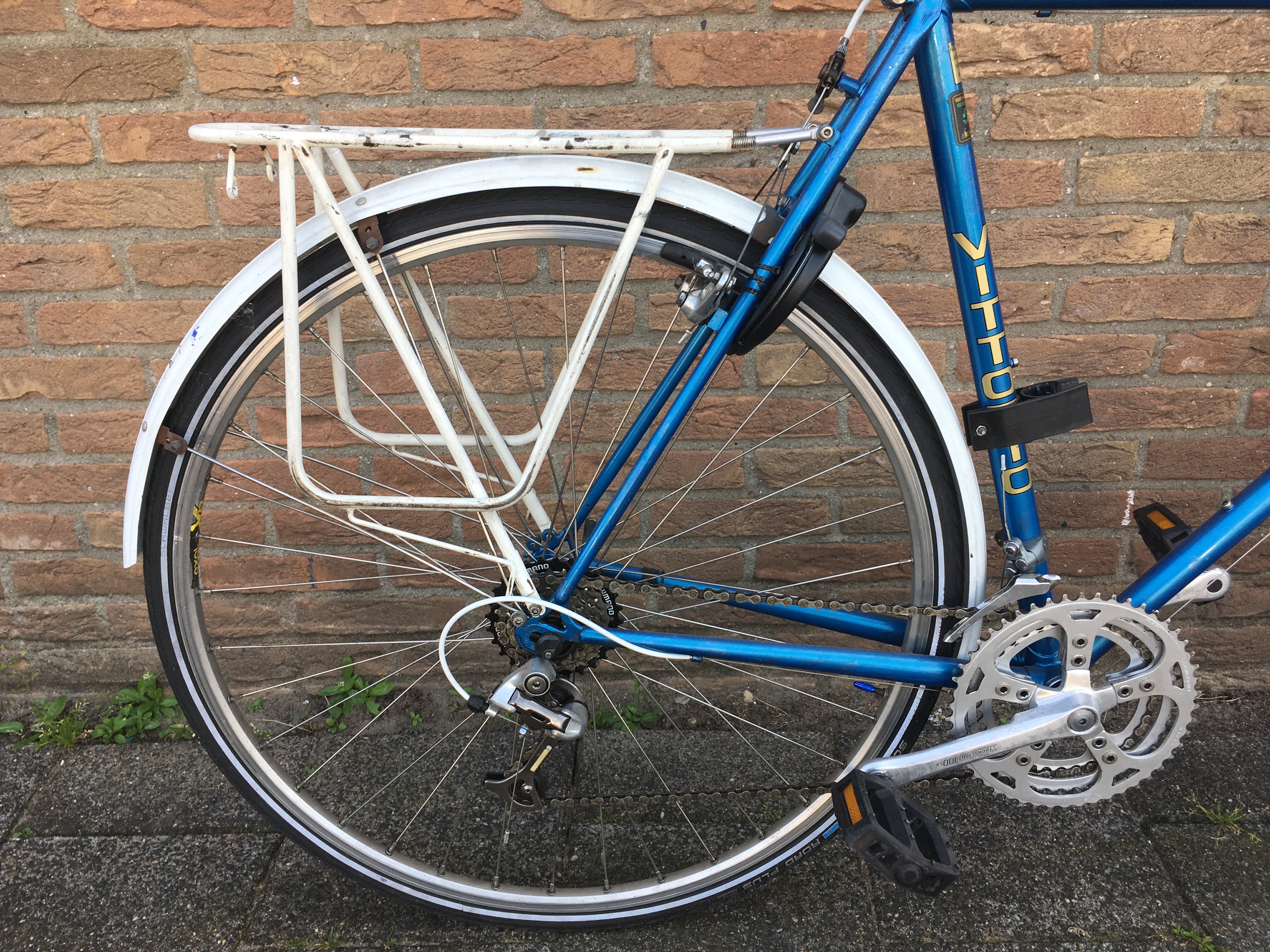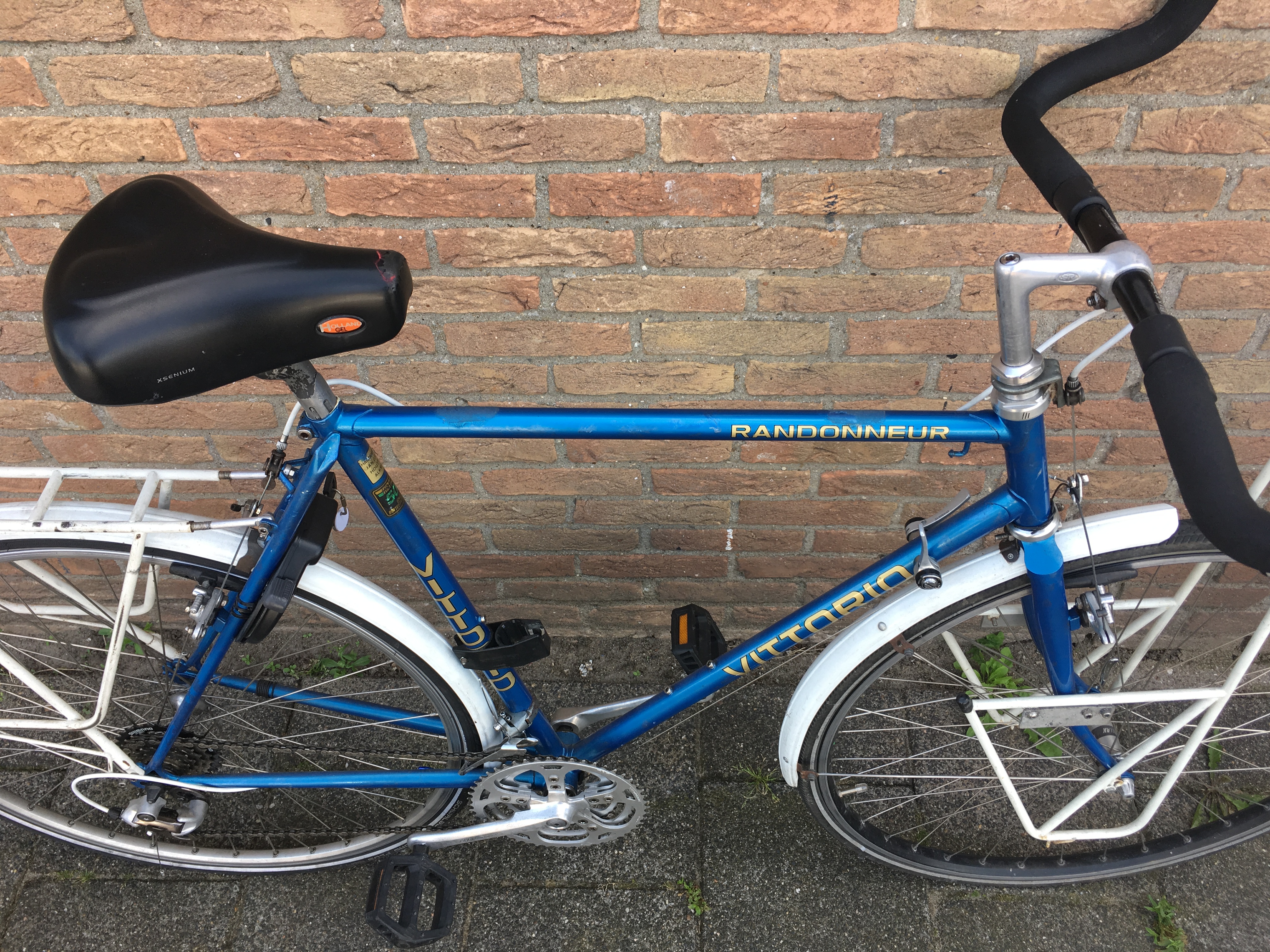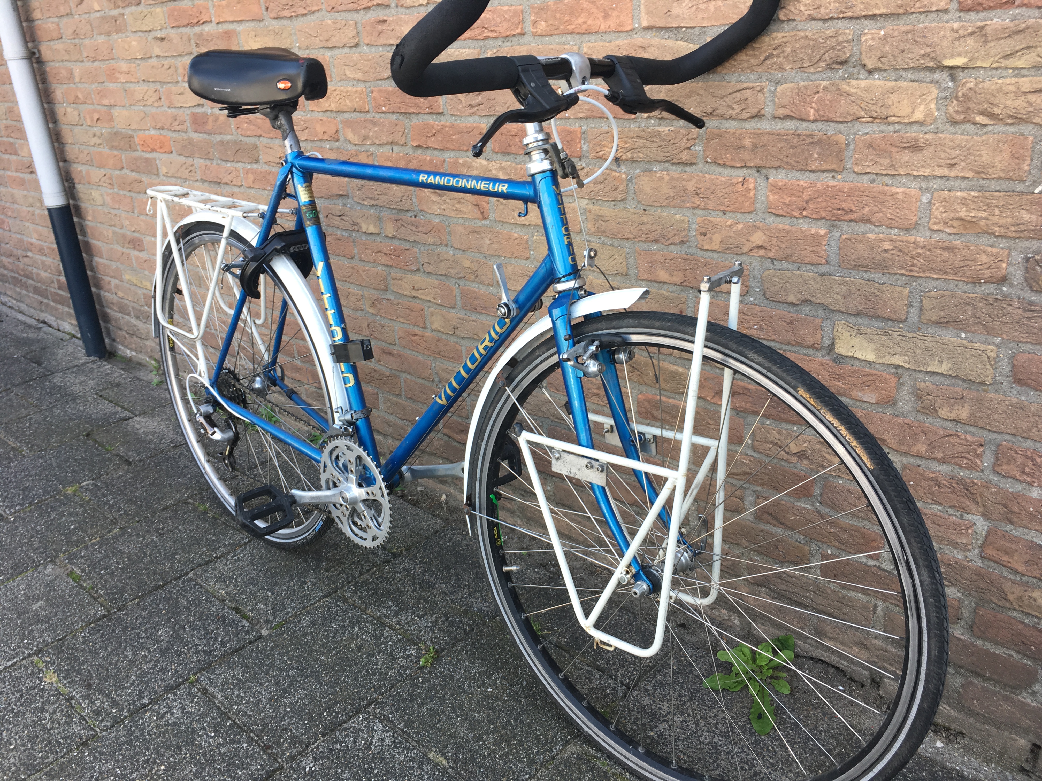 Een Vittorio randonneur uit de 80er jaren, gekocht van een gestopte wereldfietser, met de intentie om er boodschappen mee te doen, maar door te veel fietsen verzameld toch beschikbaar.