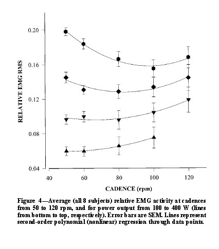 Een e-bike rijder lijkt me niet de meest sportieve en krachtige fietser, dus volgens onderstaand plaatje, zal het aantal pedaalomwentelingen wel tussen 50 en 60 liggen, zeg 60/min. (de laagste EMG-activity is waar het lichaam zich het prettigst bij voelt).