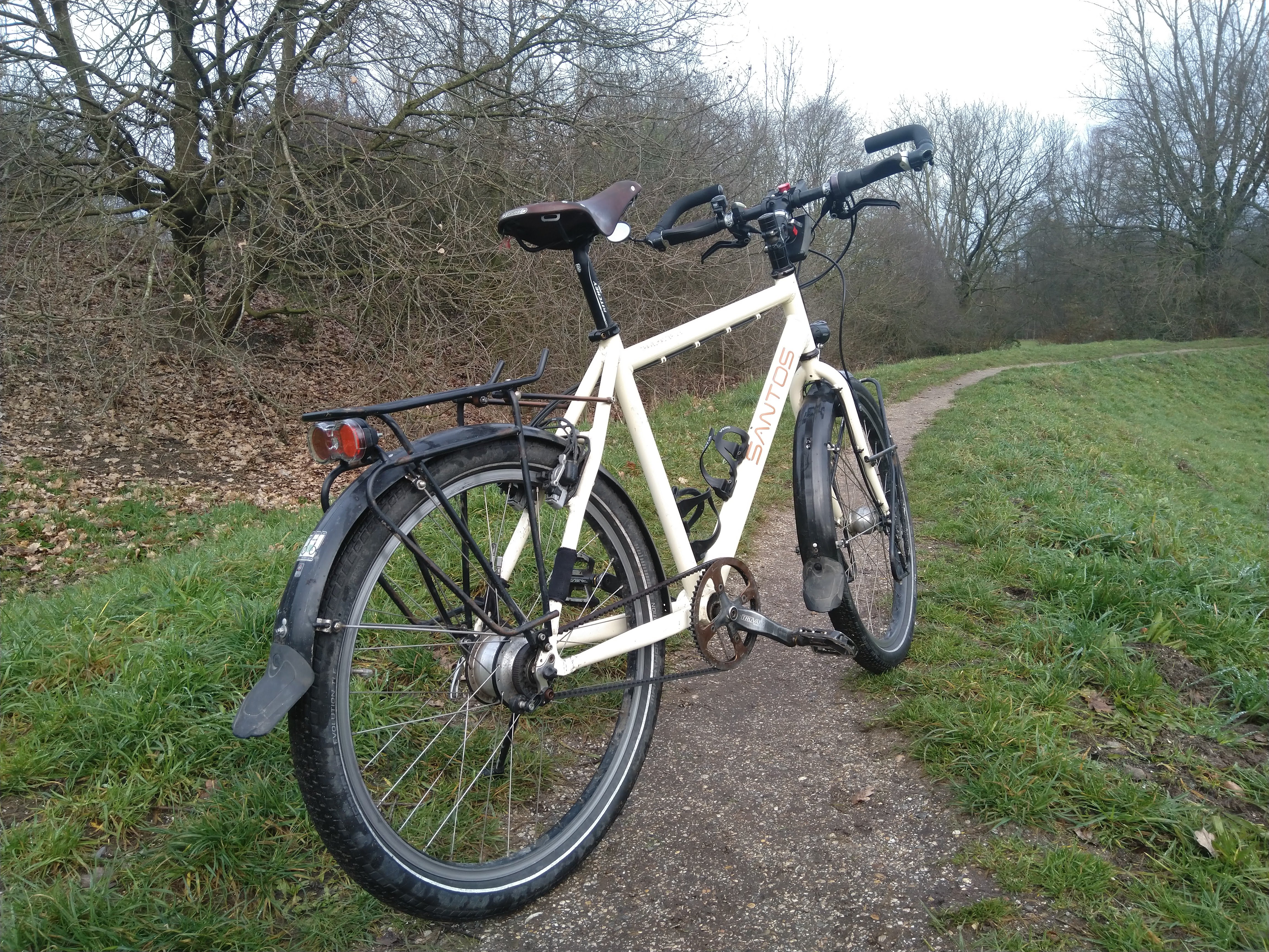 De Rohloff-naaf, de crank, de Tubus voor- en achterdrager en het stuur komen uit 2009.