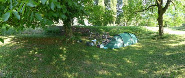 - Zie hier onze tent in een boomgaardje langs het Rijn-Rhône kanaal.