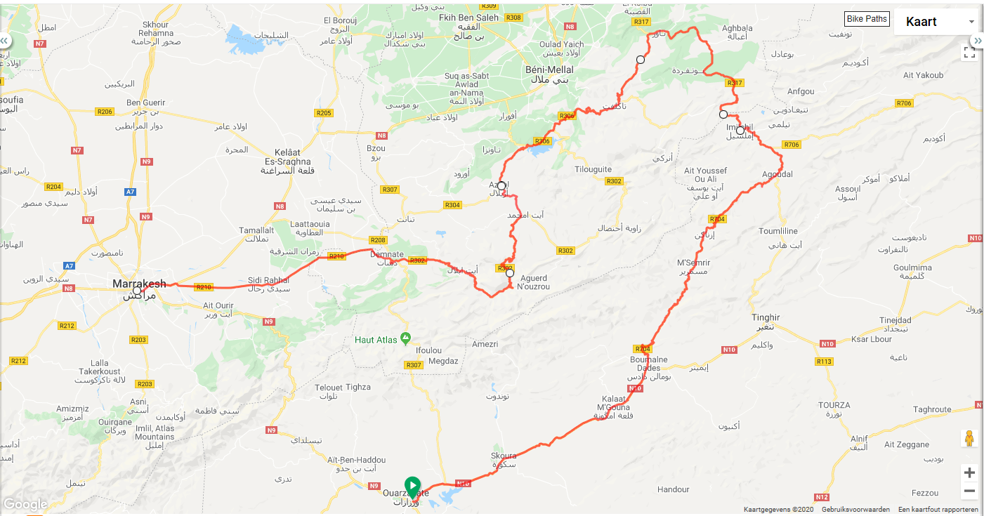 Op Wikloc had ik bovenstaande route gevonden. Deze is 731km lang. Om nu uit te komen op een, voor mij, aanvaardbare 100km per dag (met het nodige klimwerk) zal ik de N9 vanuit Marrakech naar Ouarzazate moeten nemen. Is deze weg goed te doen of erg druk met verkeer?