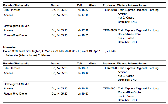 De laatste jaren zijn er veel werkzaamheden aan het spoor tussen Amiens en Rouen. Blijkbaar zijn die niet allemaal tijdig verwerkt in de Duitse treinplanner. De TER-planner van de SNCF zou wel up to date moeten zijn (zie hier).