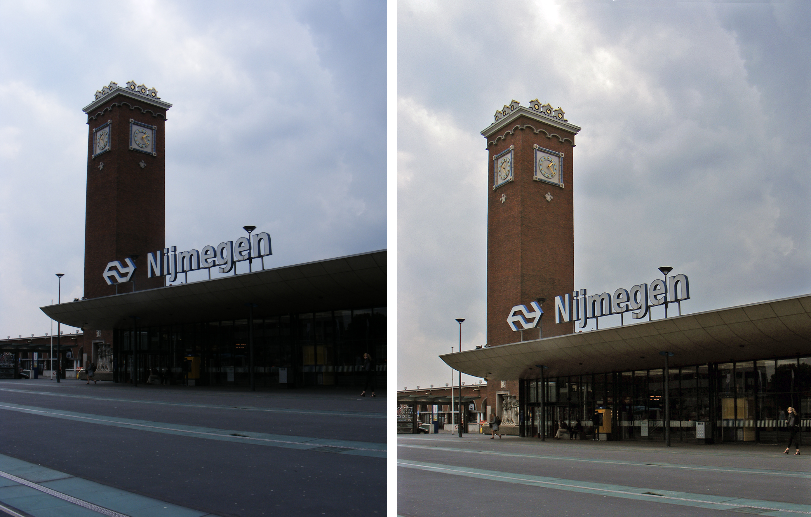 Het gaat erom dat – zoals bij het station van Nijmegen – fotograferen bij bewolkt weer wat lastig is. De digitale camera reageert automatisch op de felle lucht boven het gebouw, waardoor het station donker uitkwam.