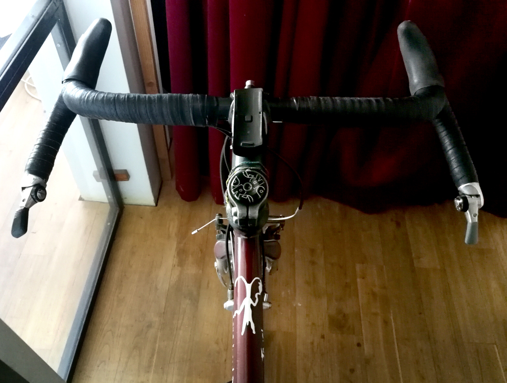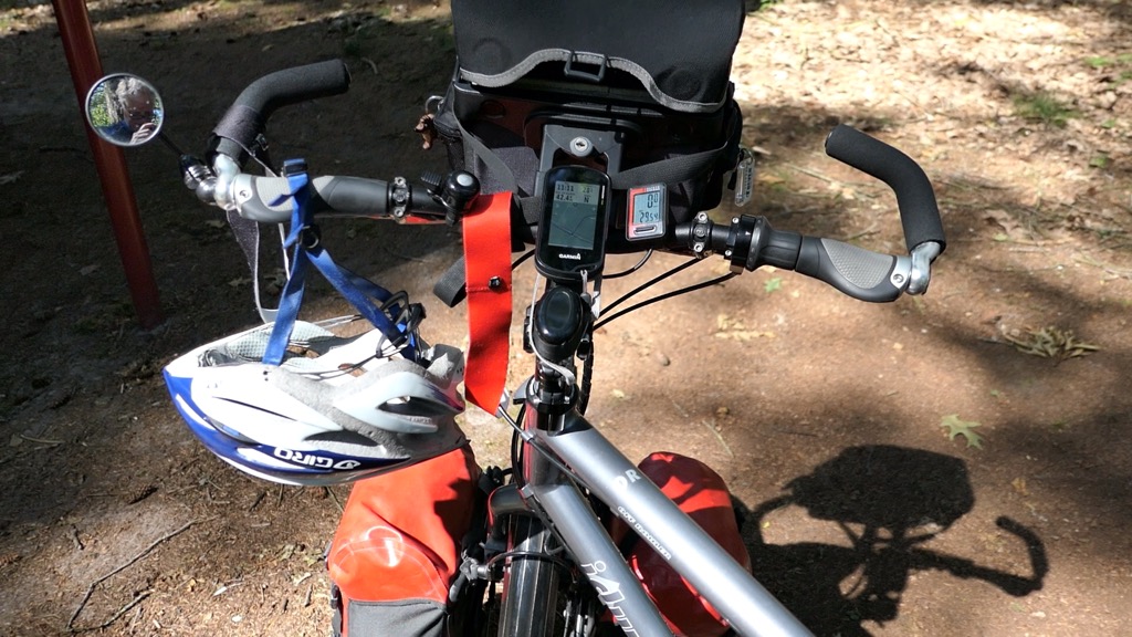 Zelf ff aftrappen: De stuurtas wordt vrijwel geheel gebruikt voor een grote camera, daarom de twee feedbags er bij (de linker bevat een boterhamzakje (tegen kruimels en hopelijk minder uitdroging) gevuld met mini-stroopwafels