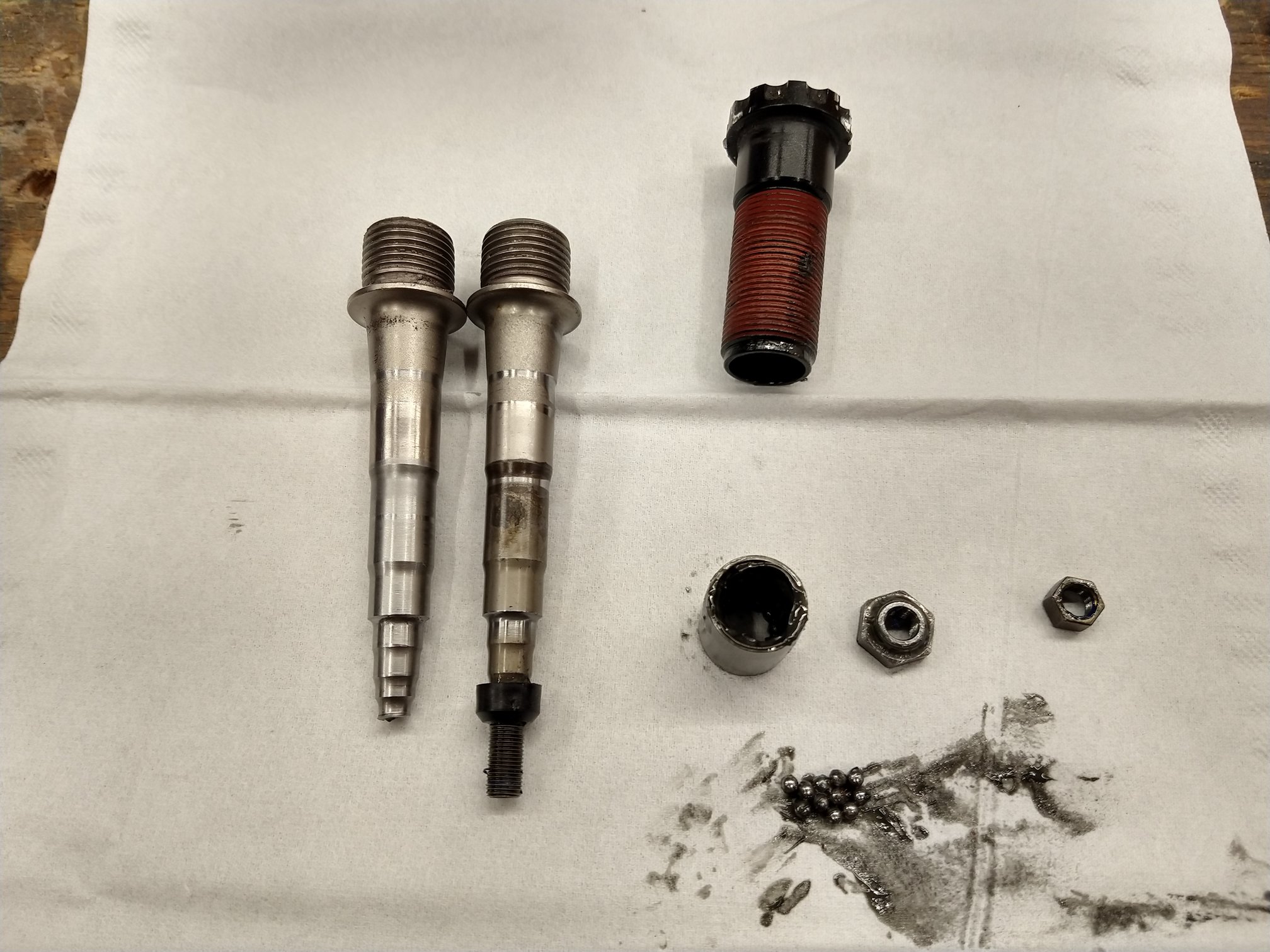 Daar is dus een stuk schroefdraad met de kogelkooi verdwenen, het buitenlager is opgebouwd uit 2 rijen kogels die heel netjes, dat dan weer wel, nastelbaar zijn. De zwarte bus duwt het buitenlager op z'n plek en fungeert tegelijk als bus voor het glijlager dat het binnenlager vormt. Wat ik wel jammer vindt is dat deze as ook al corrosie sporen vertoond, terwijl de kapotte dat niet doet![]()