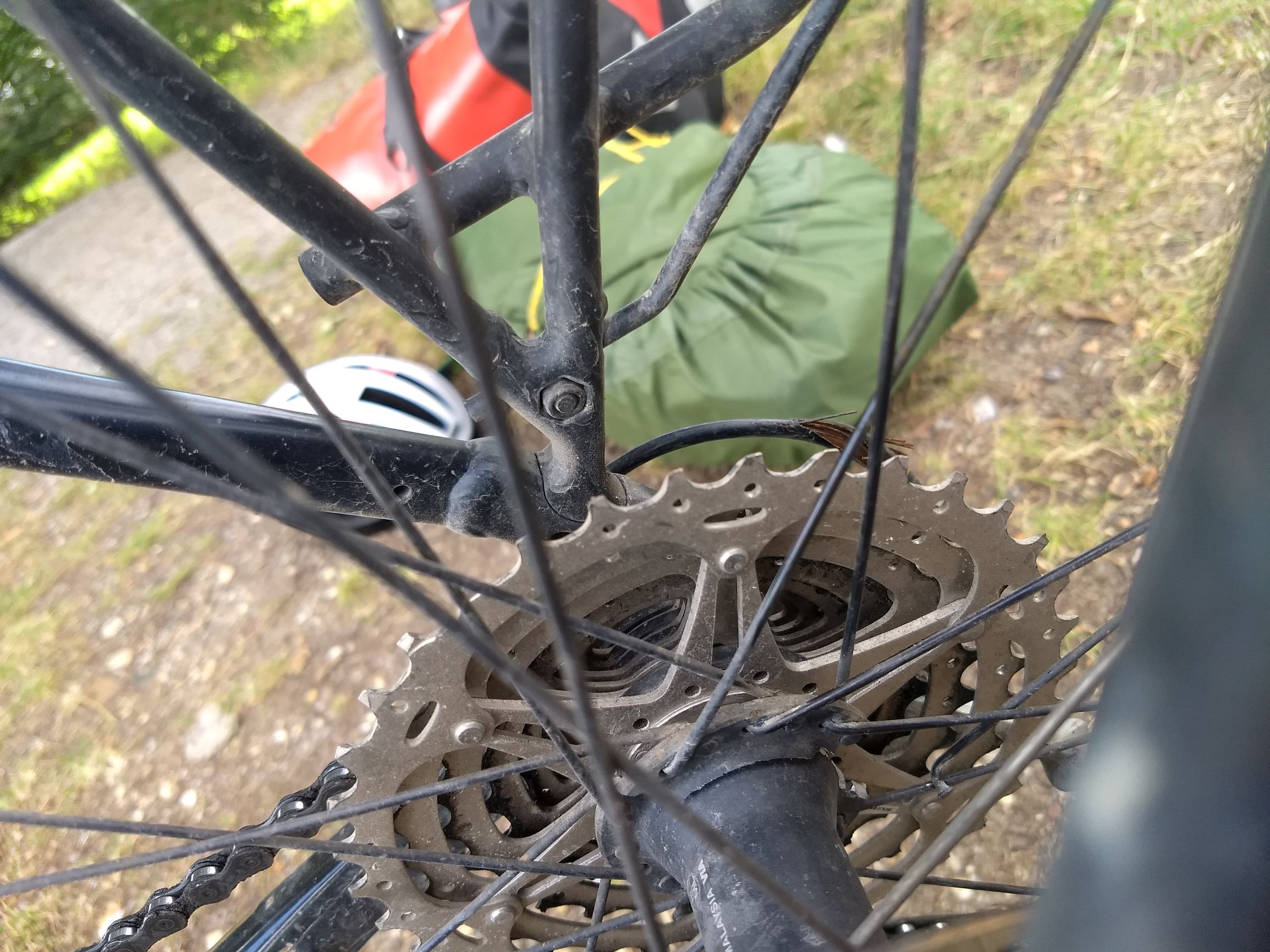 Laatst werd de net-gemonteerde (halve) kettingkast van mijn vrouw meegenomen door de ketting bij snel terugschakelen (derailleur). Kost me drie kwartier om de resten en de ketting achter het tandwiel vandaan te krijgen. Ik begon netjes maar eindigde met compleet zwarte klauwen![]()