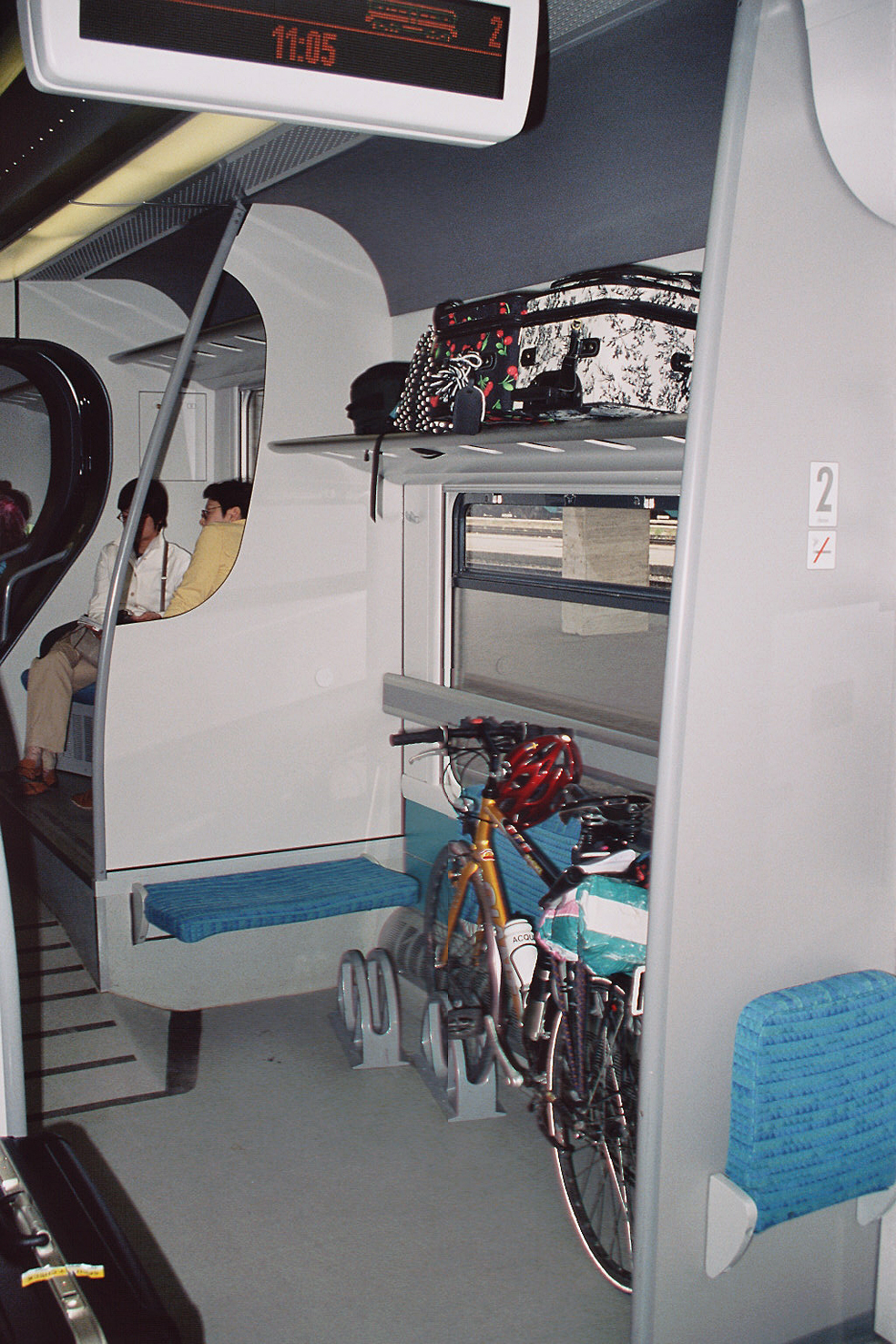 * Some trains have a dedicated compartment for transporting bicycles. When travelling in sleeping cars and couchettes, the bike must always be stored in the luggage compartment of the reserved compartment. In other cases, the bike should be placed in the luggage space or, if it is fully occupied, it should be placed in the vestibule, or in the corridor by hooking it to a fixed point available in the carriage, such as the handrail.