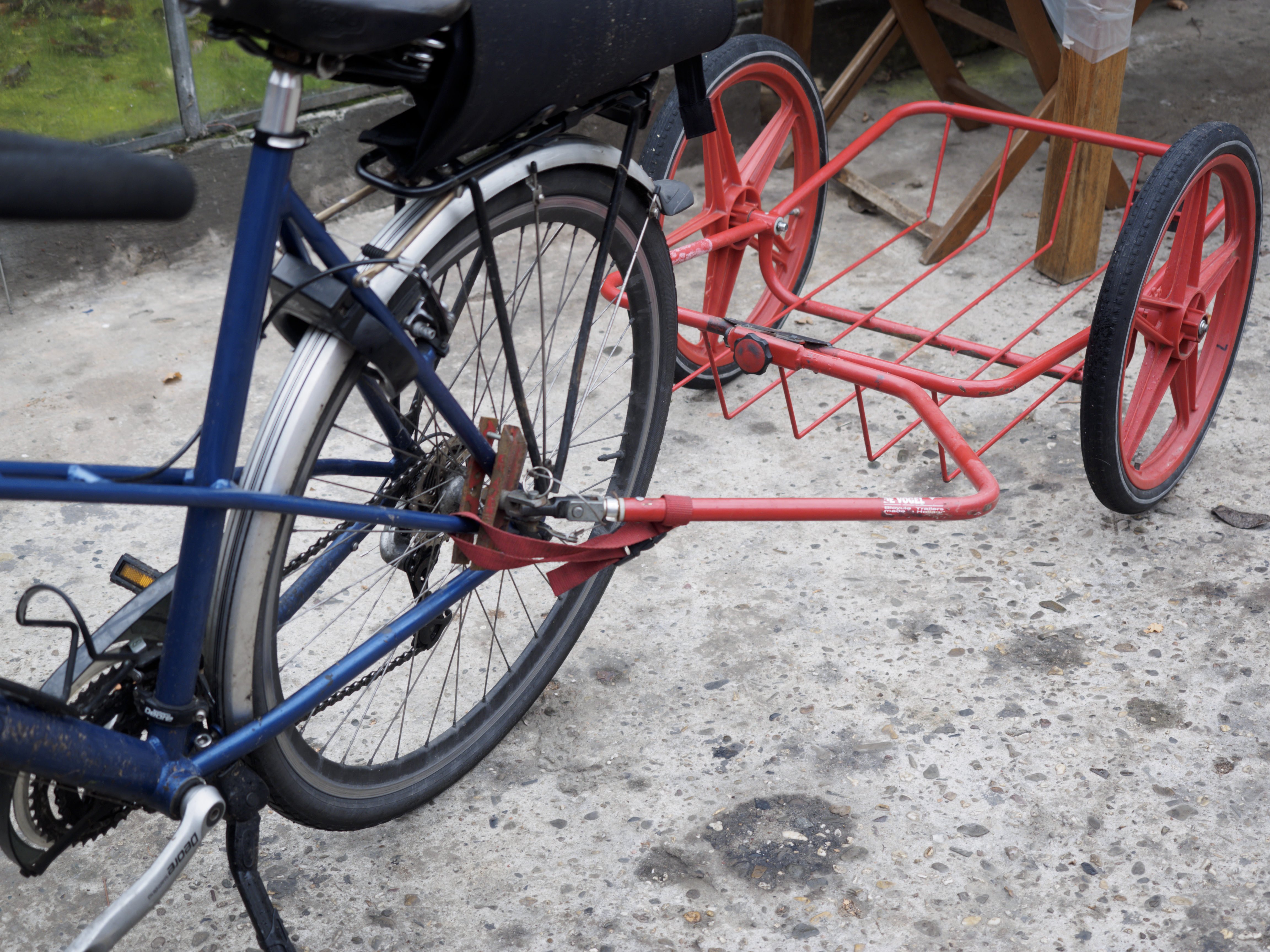 Heel veel jaar met plezier gebruikt bij onze fietsvakanties maar al jaren overbodig dus nu hoop ik anderen er een plezier mee te doen. Kar wordt gekoppeld bij de as van het achterwiel (zie foto) en dus erg stabiel. Wielen zijn uitneembaar en de dissel kan er ook af. Mocht je belangstelling hebben, laat maar weten. Over de prijs worden we het vast wel eens