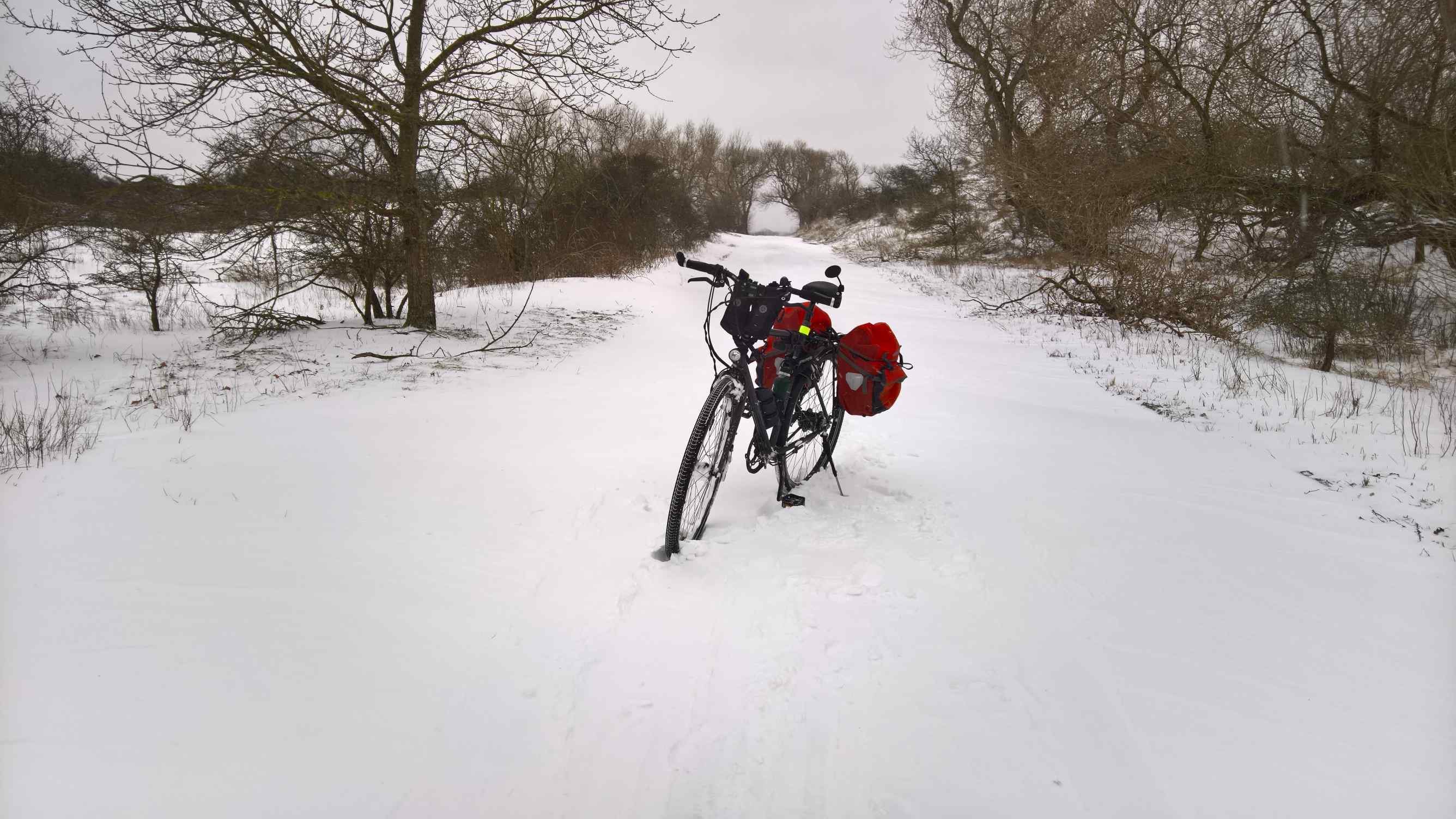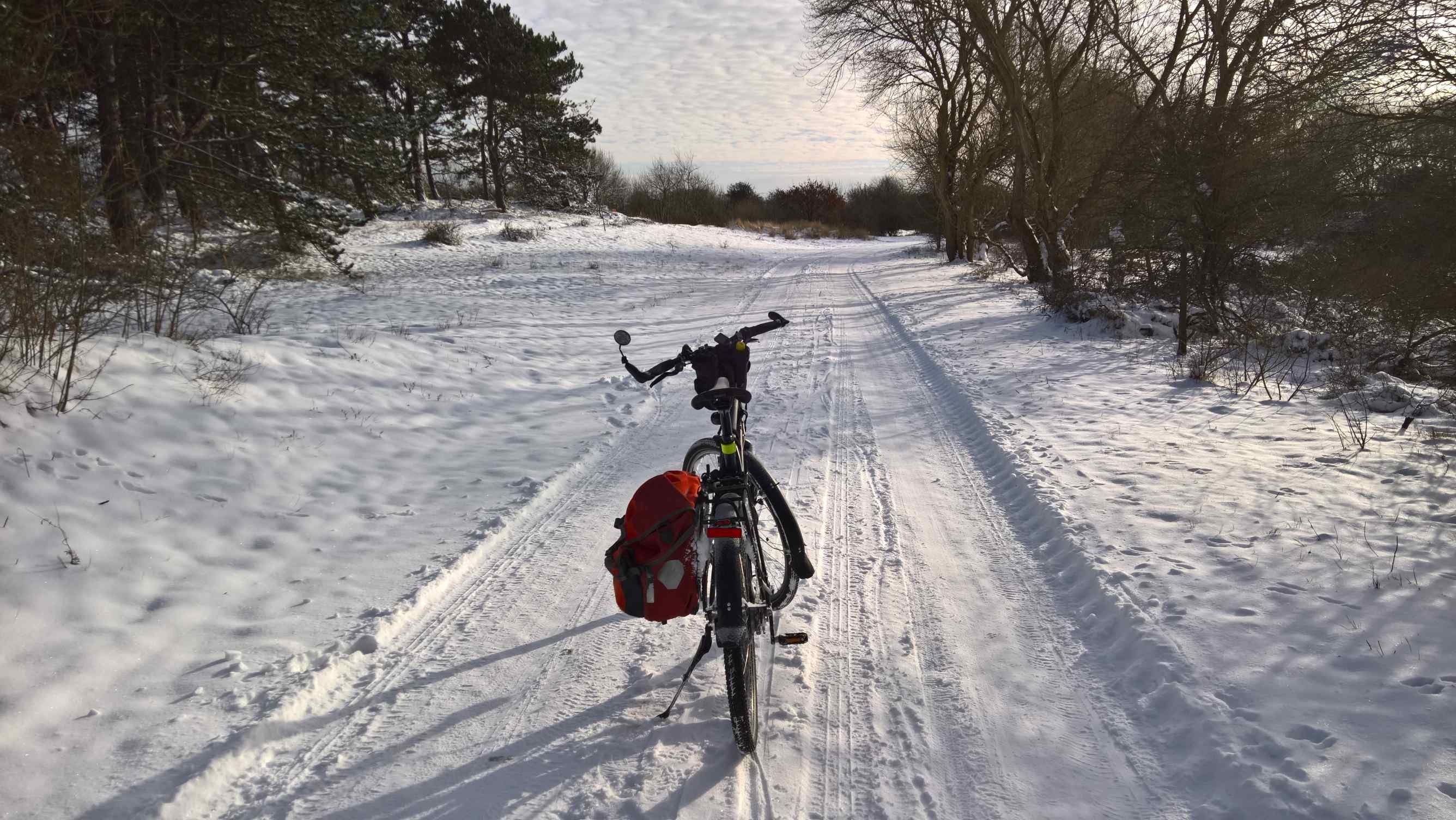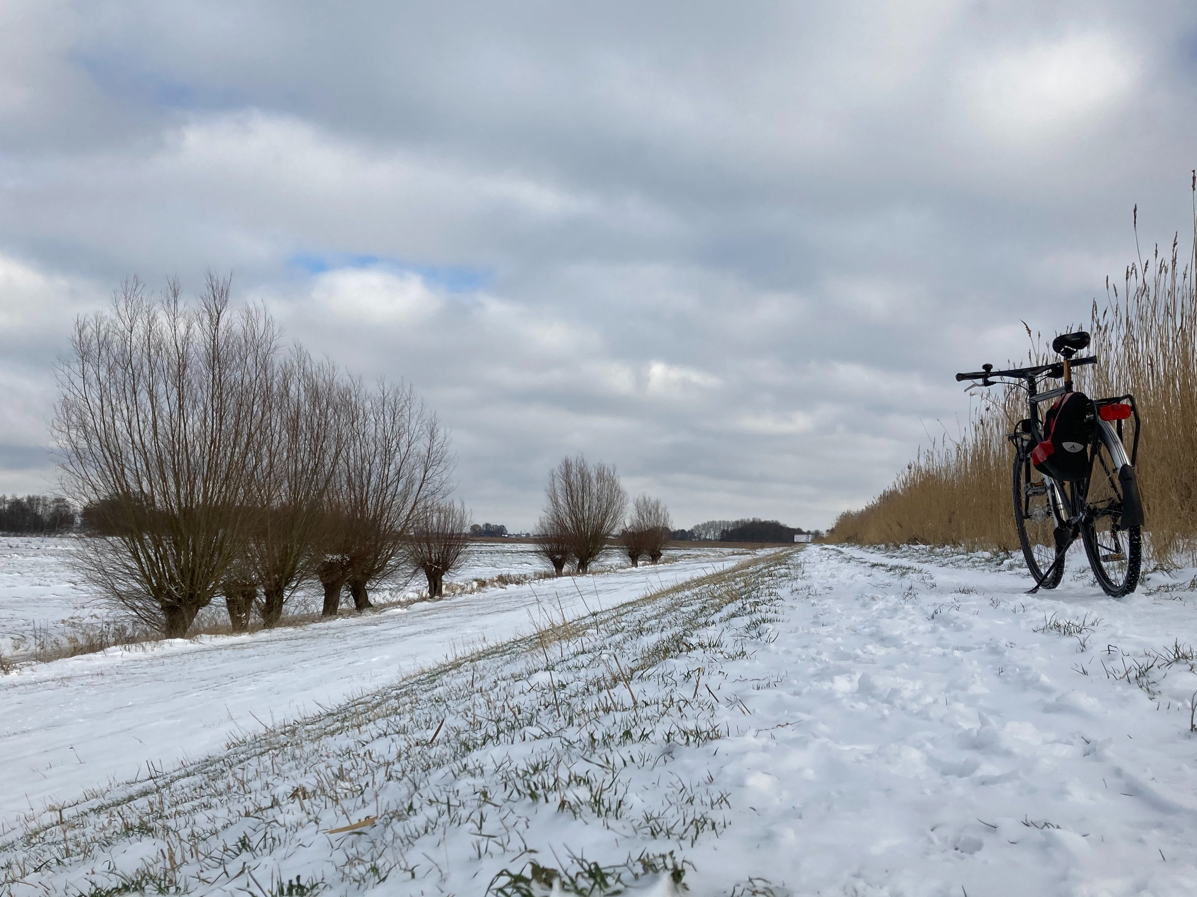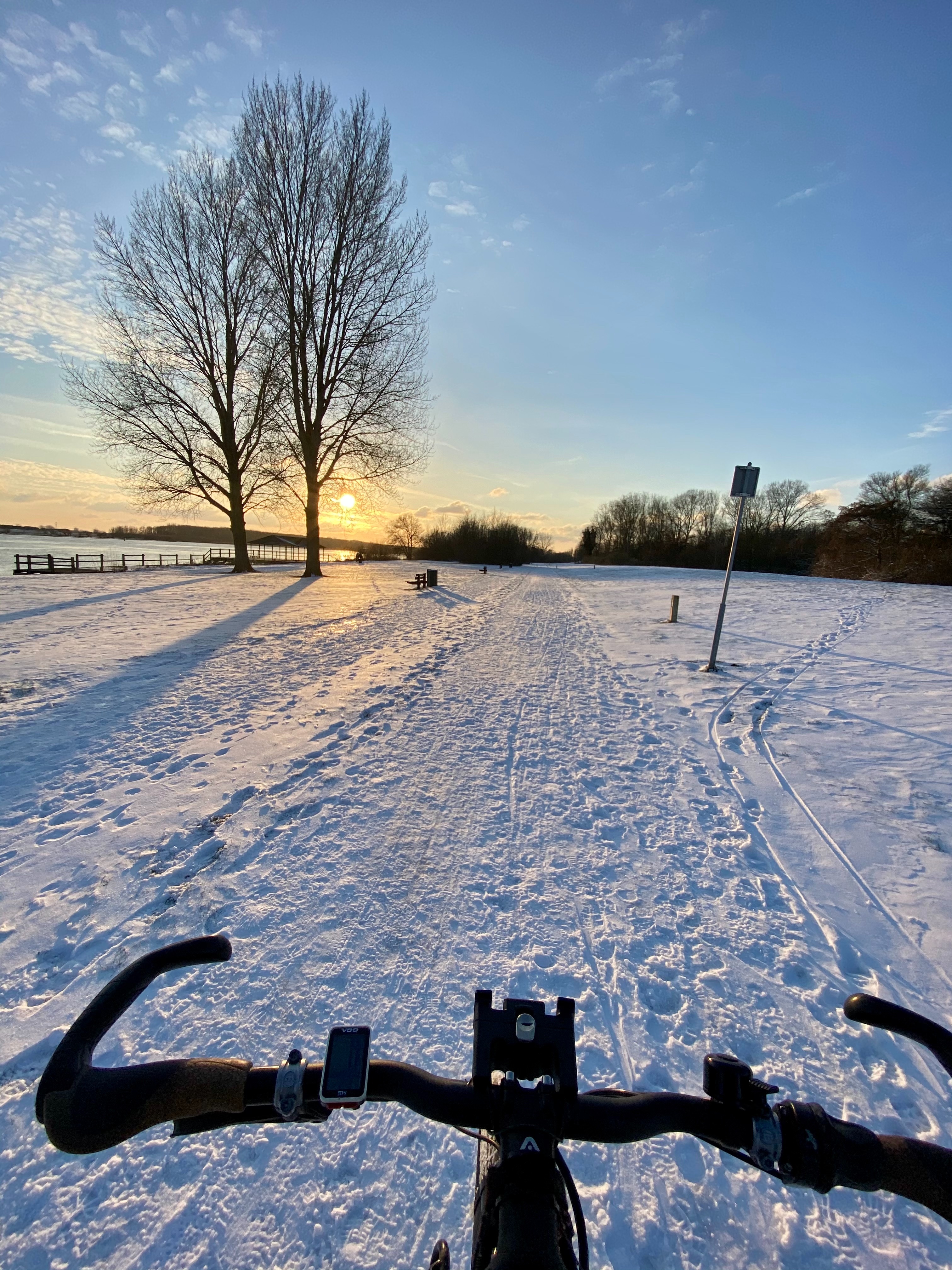 Disclaimer: Vanochtend in de net gevallen sneeuw was het nog niet glad, enkel mijn achterwiel schoof soms even weg in de diepere sneeuw. Als sneeuw aangekoekt is en het wat dooit, kan het glad worden. Met dit bericht wil ik niemand aanzetten tot waaghalzerijen in de sneeuw/op het ijs :) .