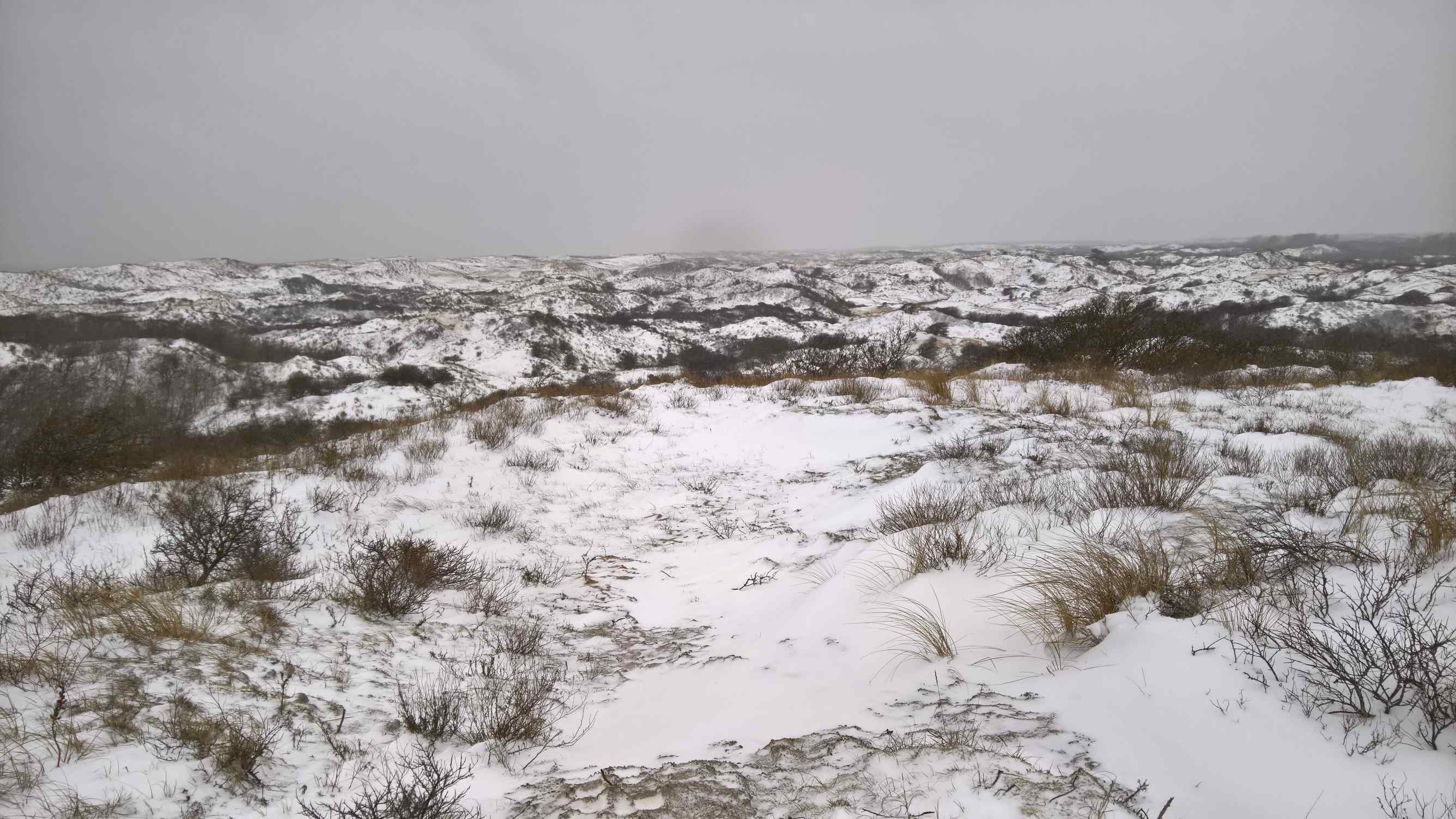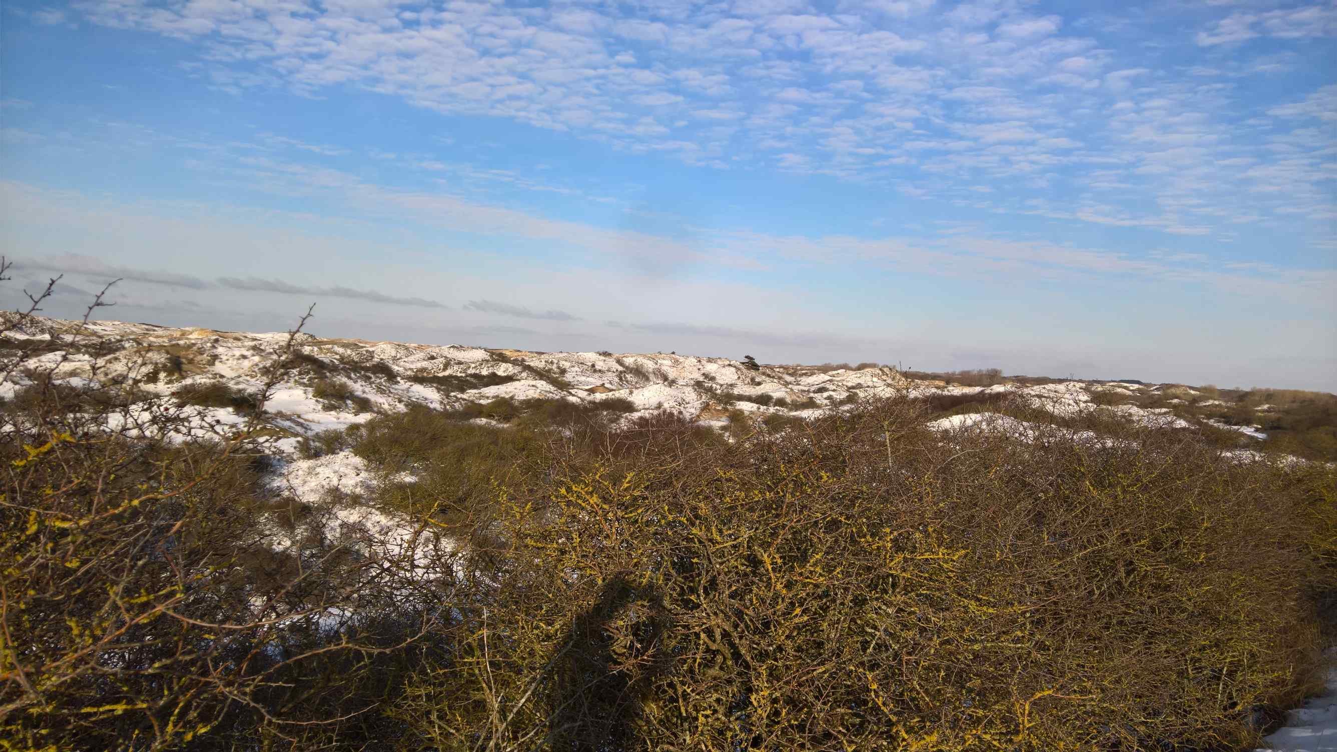 Sneeuw op fietspad was al platgetrapt zonder glad te zijn. Aan zonzijde van het duin is sneeuw al grotendeels gesmolten.