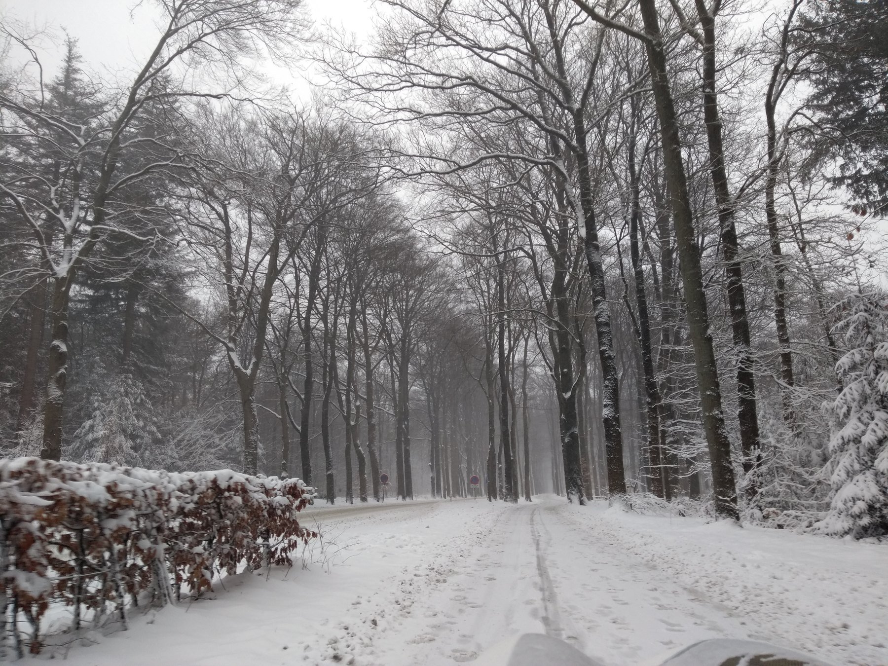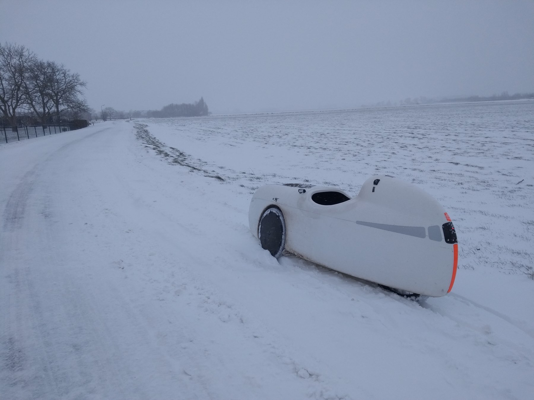 Rondje van 42km gereden vandaag door de Utrechtse Heuvelrug, met de velomobiel. Er is hier ongeveer 10cm gevallen. Door de 3 wielen val je niet om en met winterbanden heb je nog wel genoeg tractie en grip, maar de 3 sporen maken het wel zwoegen, waarschijnlijk was een gravelbike of MTB met noppebanden hier een betere keus (beiden heb ik niet). Op het eind sneeuwduinen waar niet doorheen te komen was.