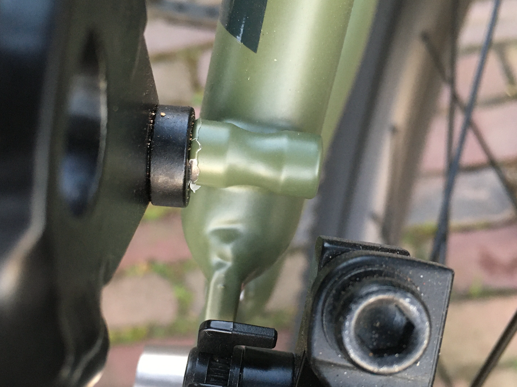 Bij het monteren vanmiddag van een spik splinter nieuwe achterdrager is er een klein beetje lak van mijn spik splinter nieuwe stalen frame afgesprongen/gebarsten.