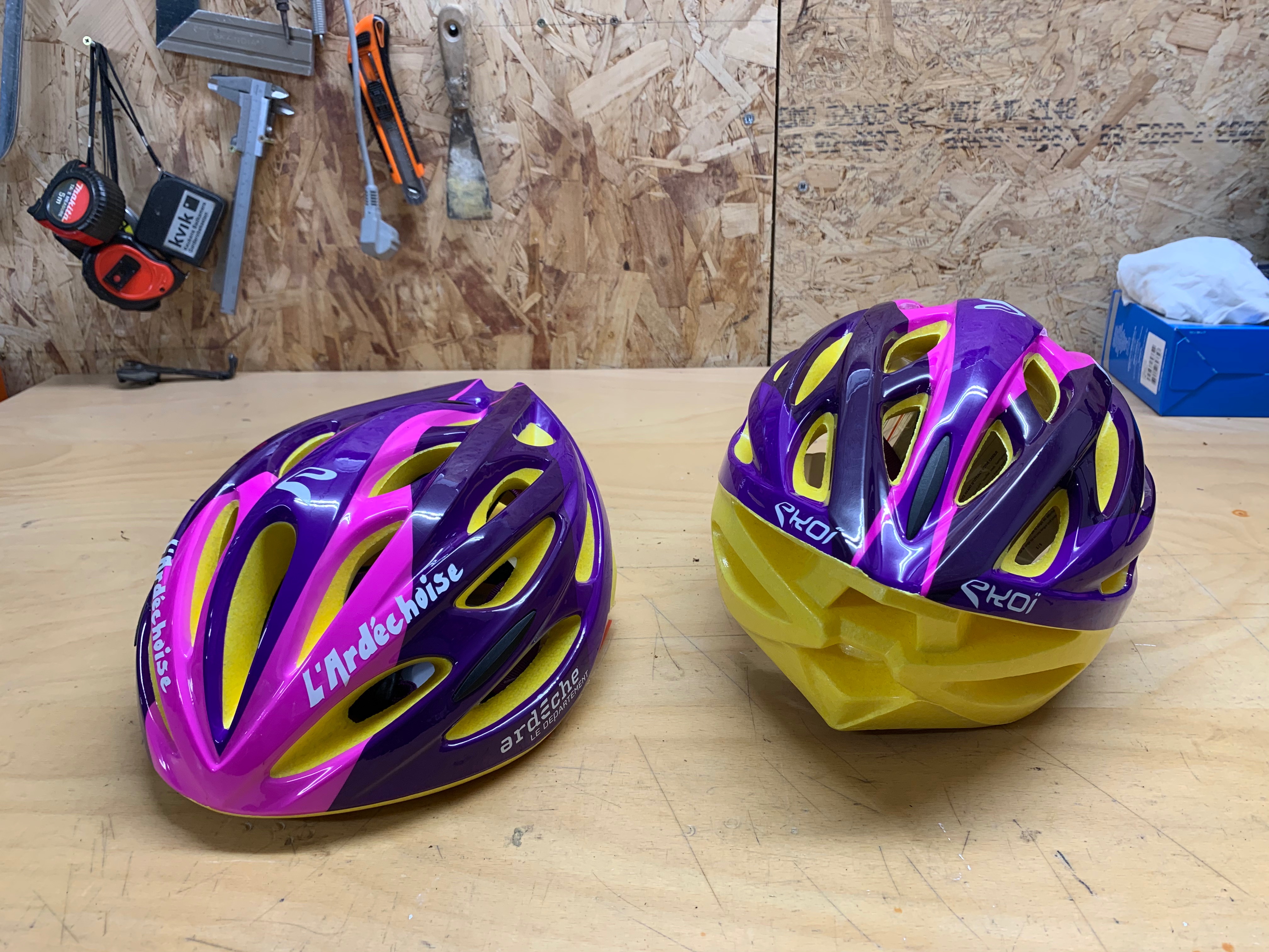 1. Twee fietshelmen van de Ardechoise. Lekker kleurrijk. Nooit gebruikt