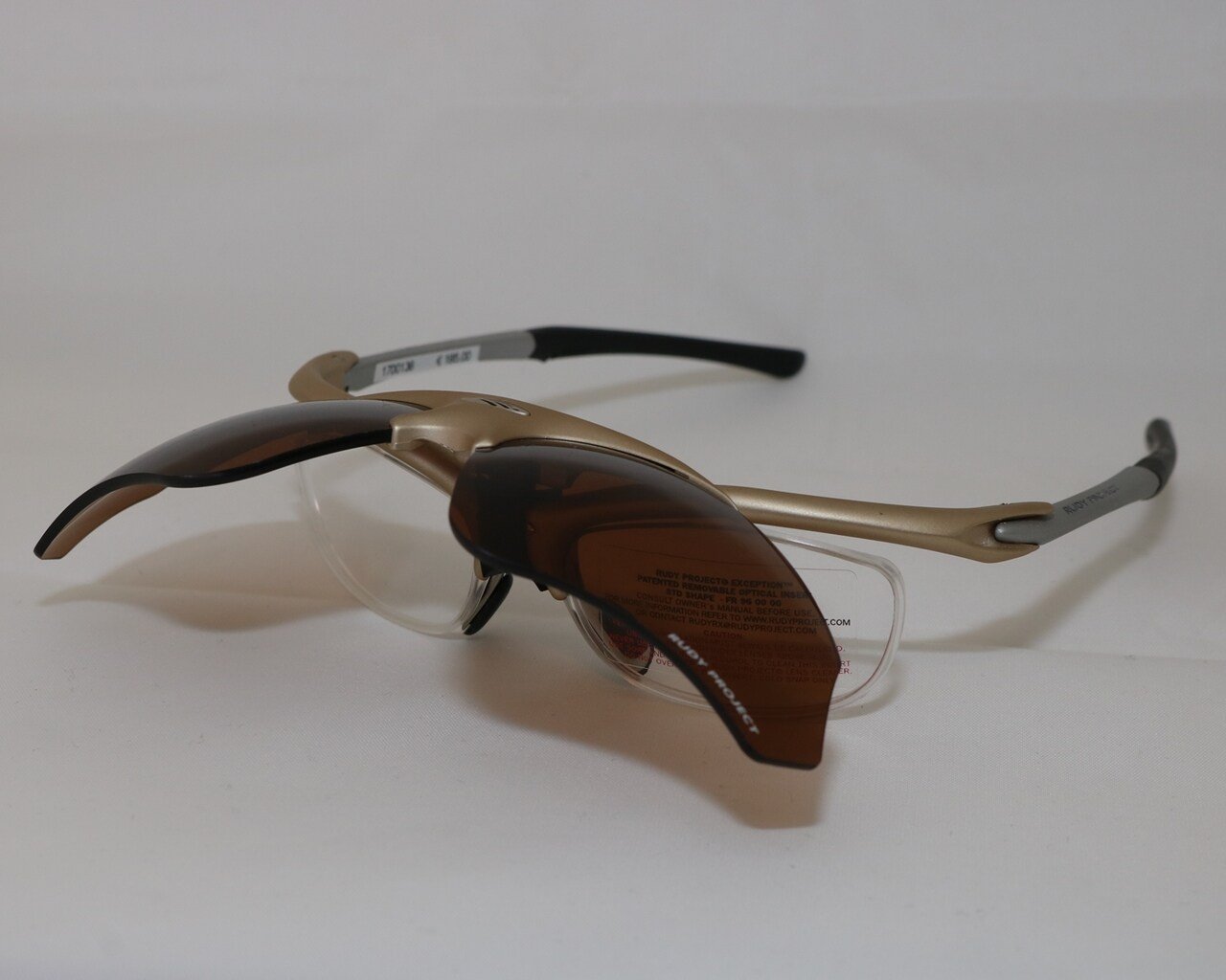 Rudy Project model "Exception STD". Titaankleurig montuur (138mm) met "Action Brown" glazen. Met foudraal.