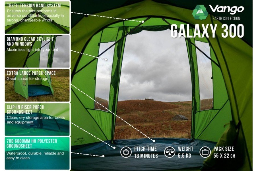VERKOCHT De Vango Galaxy 300 is een ruime tunneltent voor 3 personen. Je zet de Galaxy gemakkelijk op, want de binnen- en buitentent zitten aan elkaar vast.