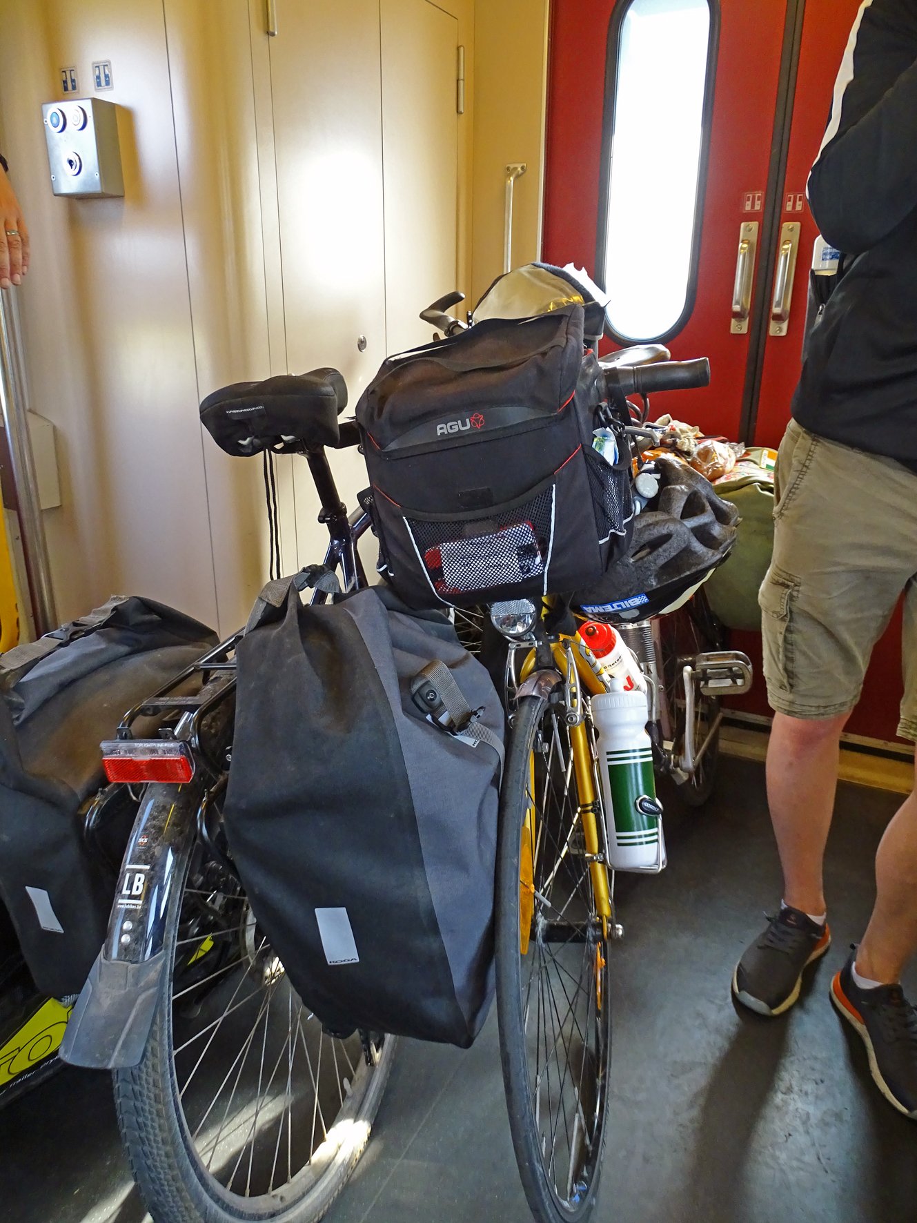 Maar de fietsruimte was nogal vol. M'n fiets stond tegen de rode deur aan in de kop van de wagon. Geeft niet, daar was toch de locomotief. Naast mij een andere fiets met een bobjack erbij, wat nogal wat ruimte in beslag nam.