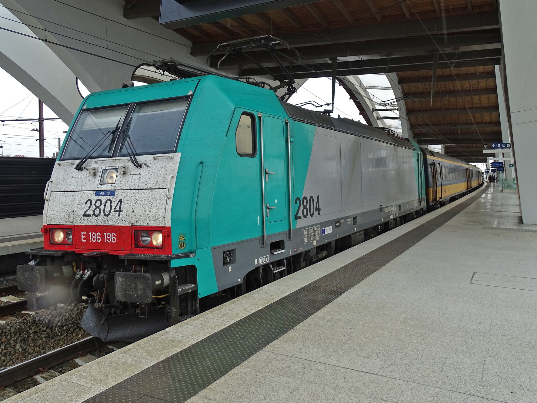 Op Schiphol Airport overgestapt en de wachttijd was 50 minuten, zodat ik een kijkje nemen in de grote Plaza-hal boven. Toen kwam er een "Brusselse" IC-trein. Blauw van boven en geel van onder. Voor en achter een mintgroene locomotief van Bombardier TRAXX MS-2, waarschijnlijk werd de voorste loc dan als stuurstand gebruikt voor de achterste.