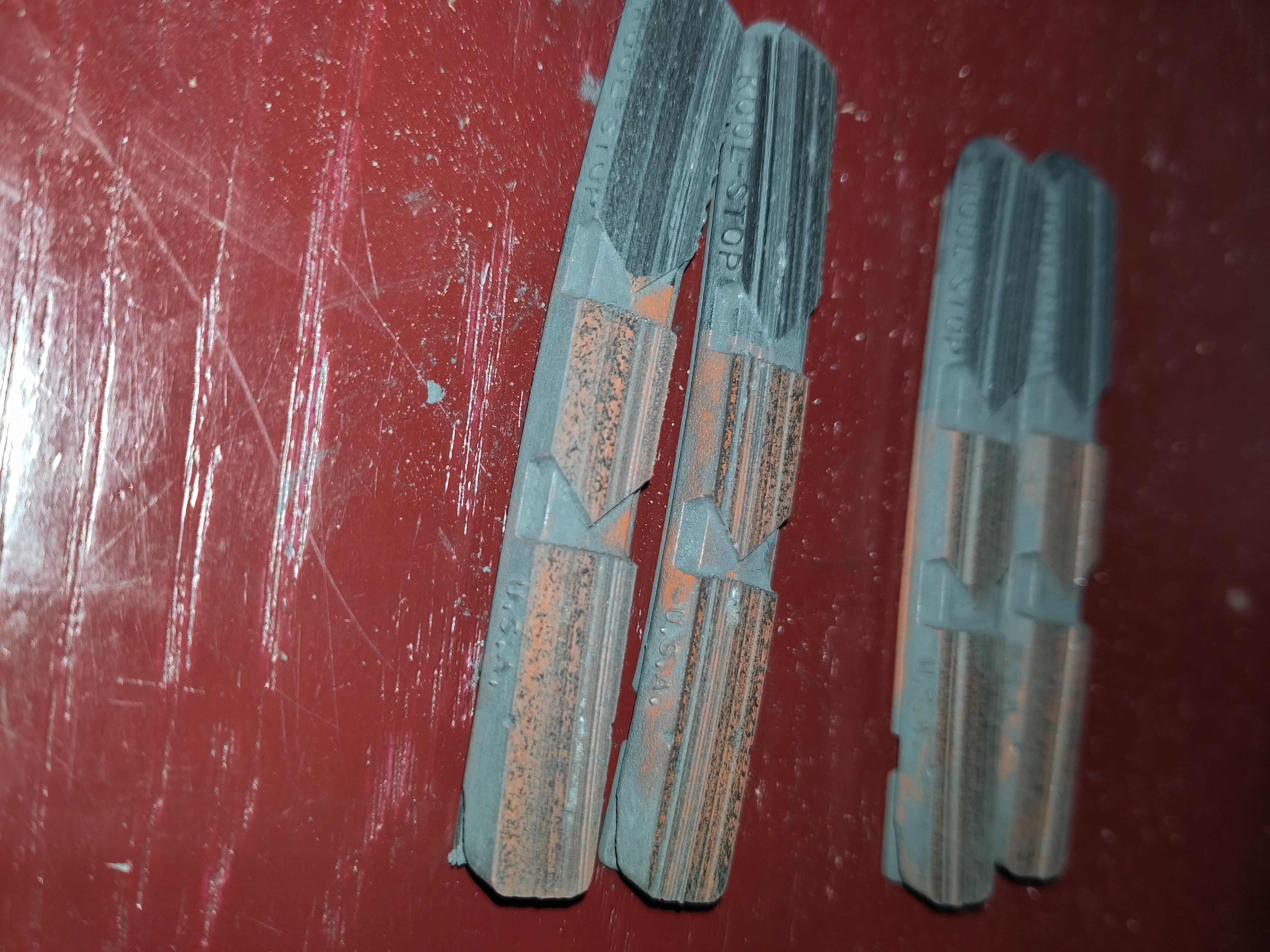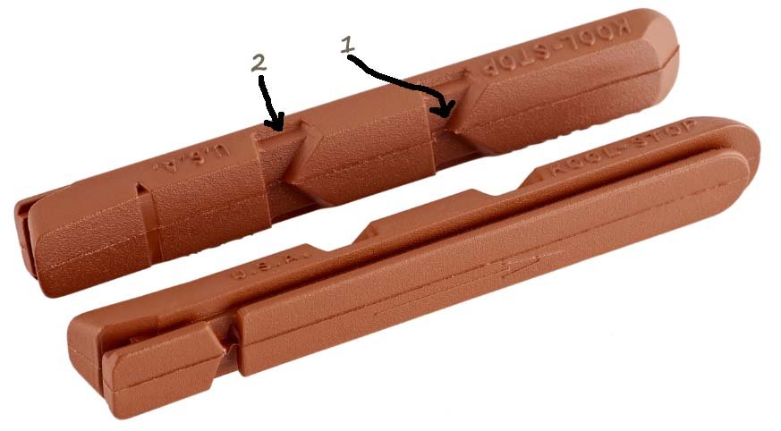 Ik vraag me af wanneer ik mijn koolstop v-brake remblokjes moet vervangen. Als de inkepingen (1) weggesleten zijn, en je met een egaal oppervlak remt, of mag je nog wat verder gaan, en verder remmen op laag twee 2 (zonder inkepingen)