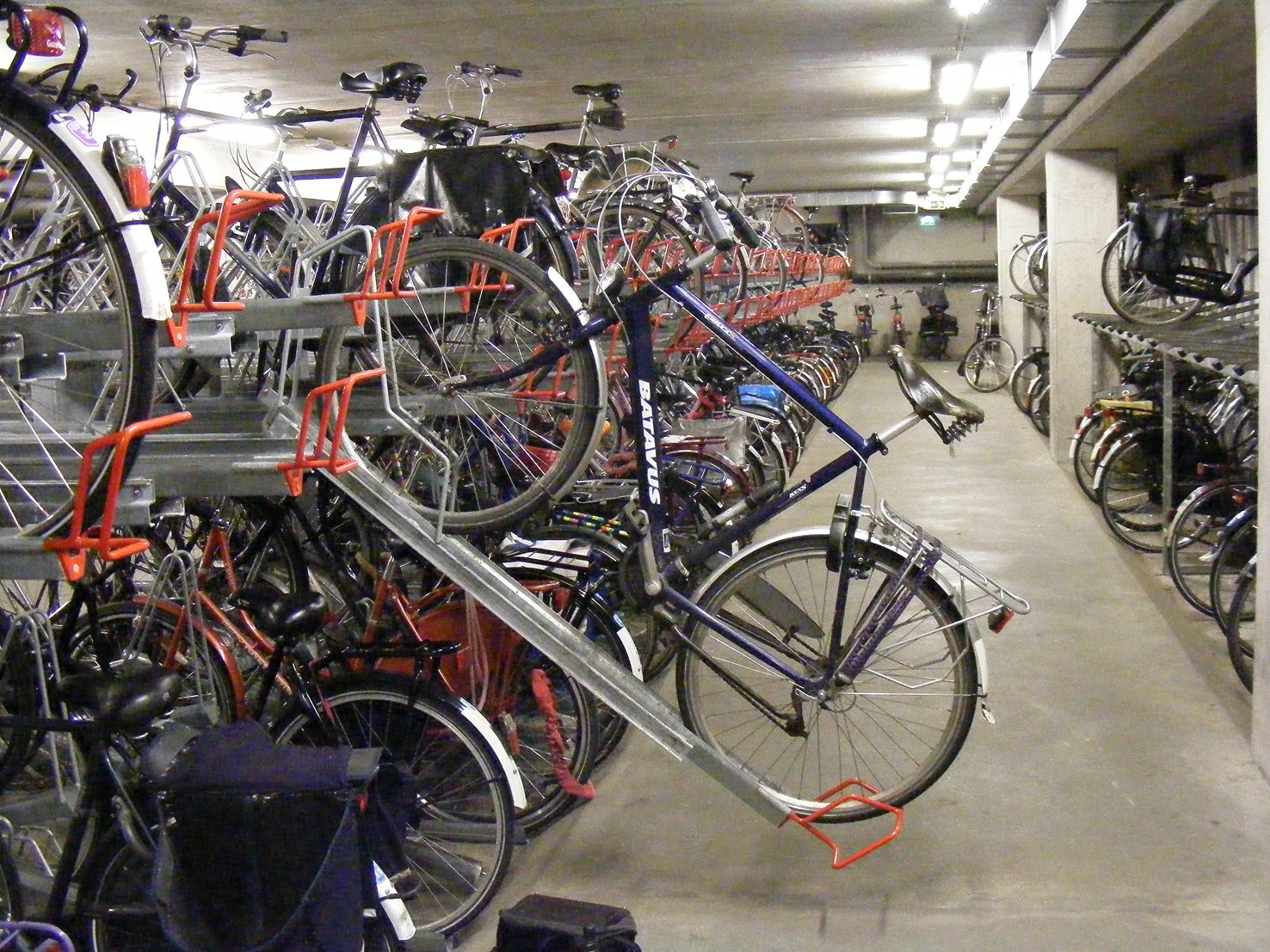 Zoiets als dit? In de stalling van het Groninger Hoofdstation. Hier hangt een bordje: heren boven, dames onder. De foto is nog van 6 mei 2013, na m'n pensionering heb ik de blauwe Batavus verkocht en hij rijdt nu ergens in Venray rond. Was een heel prima stadsfiets.