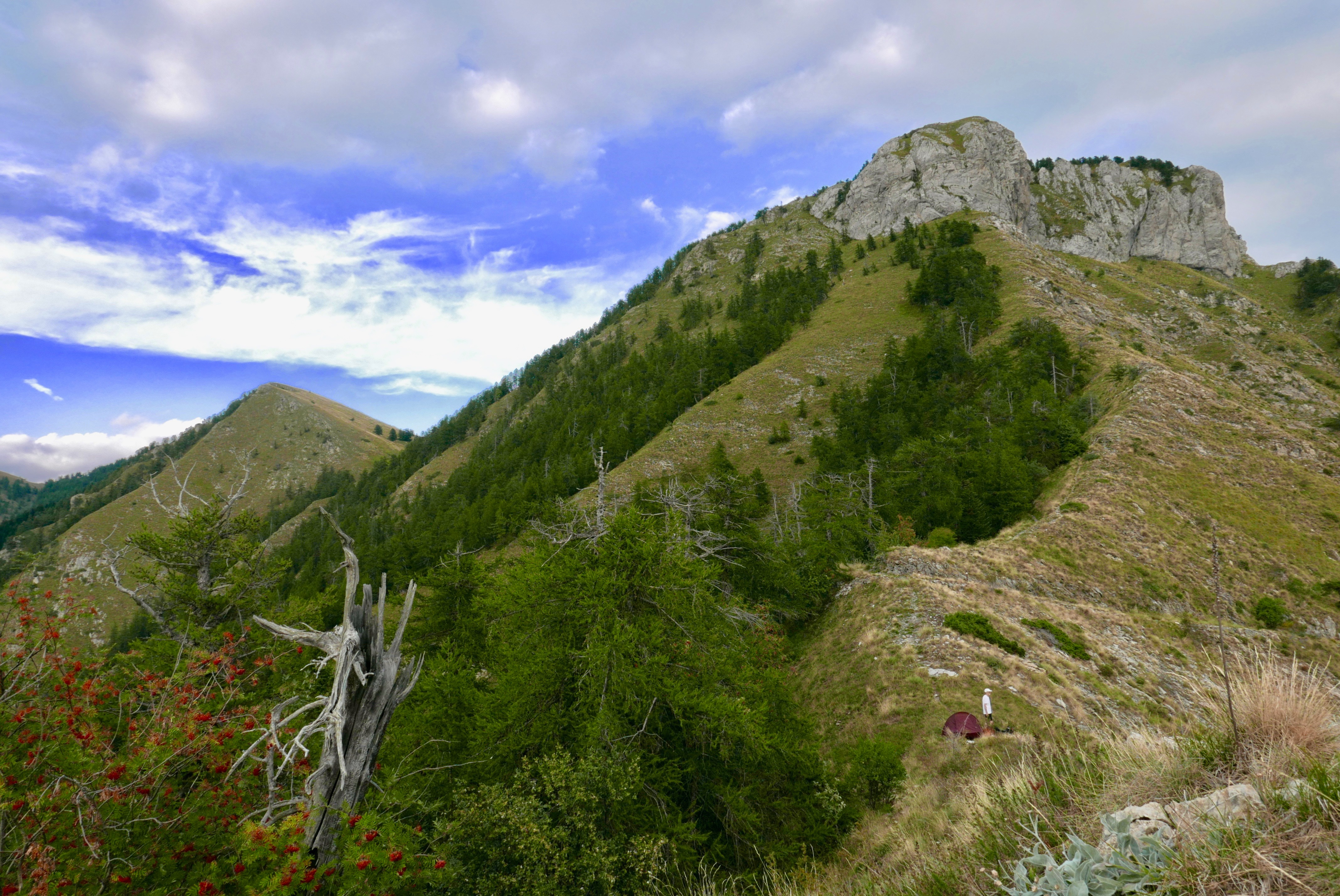 De afdaling van de Passo di Fonte Dragurina is een prachtige single track die deels in de rotsen is uitgehouwen en langs diepe afgronden voert. Ik geniet, ondanks alles. Ergens op een rotskam sla ik mijn kamp op, kook ik mijn potje en duik ik vroeg mijn slaapzak in.