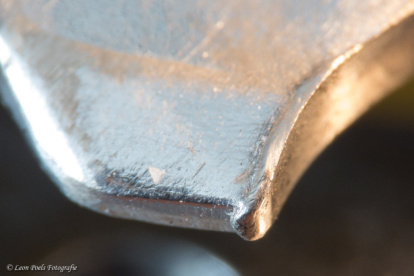 Van de andere kant zien we geen slijtage maar onbeschadigd is het ook niet. Zie het hoekje aan de bovenkant. Waarschijnlijk komt dit door het schakelen: