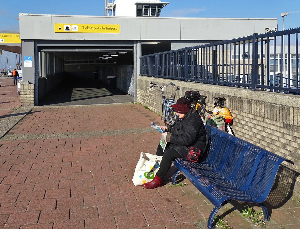 Eenmaal aan boord neemt het personeel van Doeksen de fietsen van de passagiers over en zij zetten die tegen een wand, direct naast de geopende voorboeg. De boot is de MS "Friesland". Er zijn ook snelle catamarans, maar daar mogen geen fietsen mee.