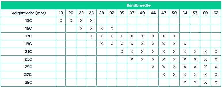 Op een velg van een fiets passen verschillende maten fietsbanden. Dit kan het wat verwarrend maken. Banden met een gelijke diameter- het tweede getal van de ETRTO-maat - zijn onderling uitwisselbaar op een velg met dezelfde diameter. Op een velg met een diameter van 622 millimeter past dus een band met de maat 28-622, 32-622 en 37-622. Je moet wel letten op de breedte van de velg. Een smalle band past niet op een brede velg en andersom. In het onderstaande tabel lees je af welke combinaties bandbreedte en velgbreedte (in millimeters) er allemal mogelijk zijn. Op de horizontale as staat de bandbreedte in millimeters en op de verticale as de velgbreedte in millimeters: