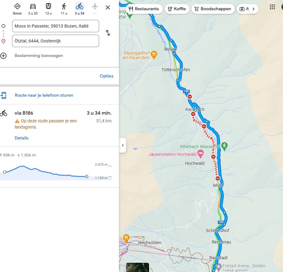 Het klopt inderdaad dat als je Goolge maps een fietsroute laat berekenen van het begin van het Ötztal naar het eind dat je dan gewoon een route door het dal krijgt. Maar hoe betrouwbaar of up to date is deze informatie?