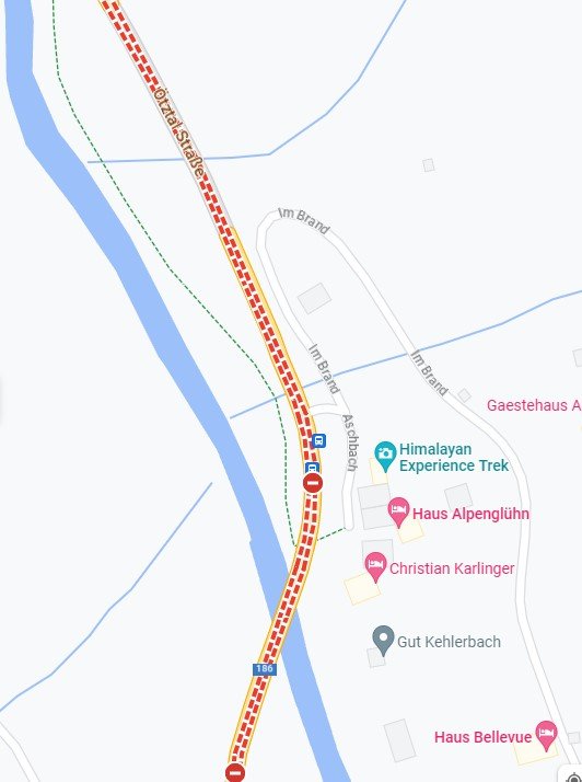 Op een aantal plekken in het Ötztal is het fietspad afgesloten vanwege schade. Ik heb voor twee punten gecheckt wat Google maps doet als je een fietsroute in die buurt plant, in bijde gevallen stuurt Google je over de afgesloten fietspaden. Google is dus blijkbaar niet betrouwbaar voor dit soort actuele informatie over fietsroutes.