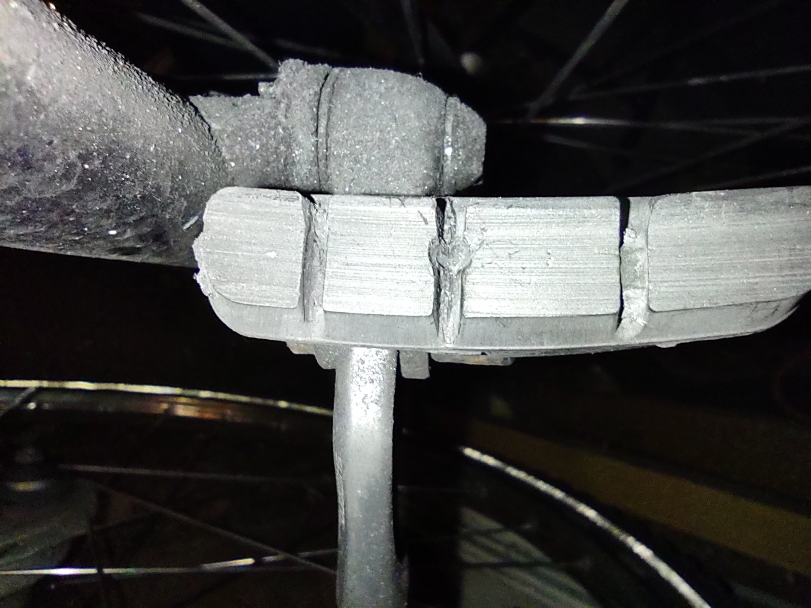 Ik weet niet goed hoe het inwendige van deze blokjes eruit ziet. Het lijkt erop dat het frictiemateriaal om een metalen steunvlak heen zit. Ik weet niet hoeveel materiaal er 'boven' dat steunvlak zit. Tussen dat vlak en de velg. Ik zou wel een goede afbeelding van een versleten blokje willen zien of een dwarsdoorsnede als iemand die te vinden weet.