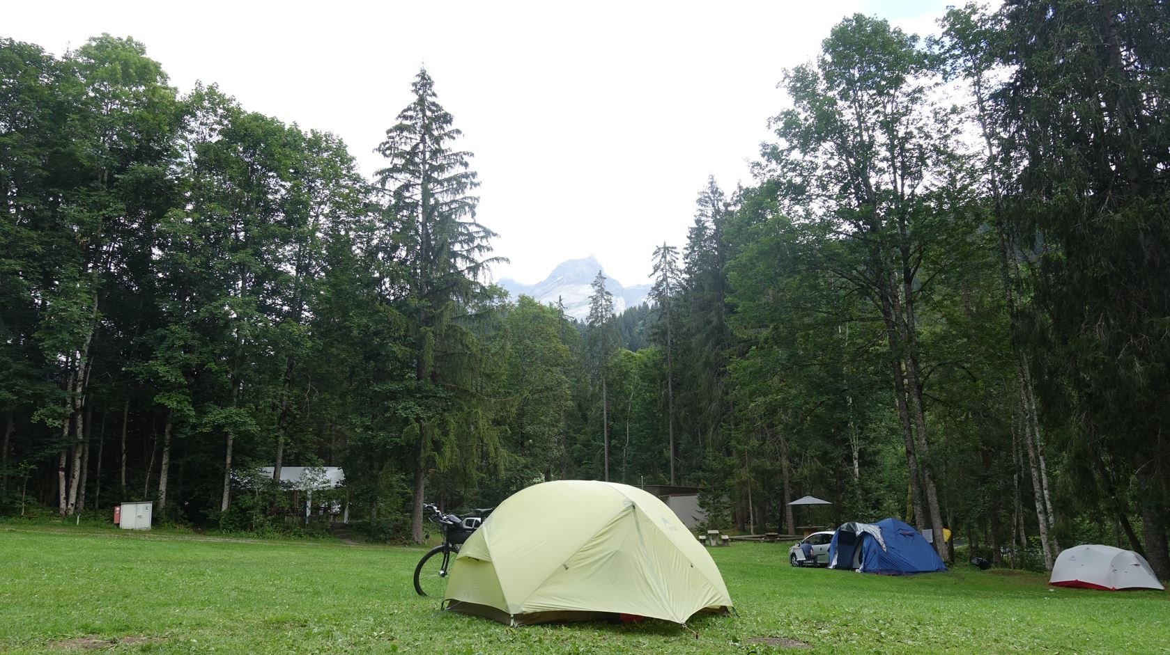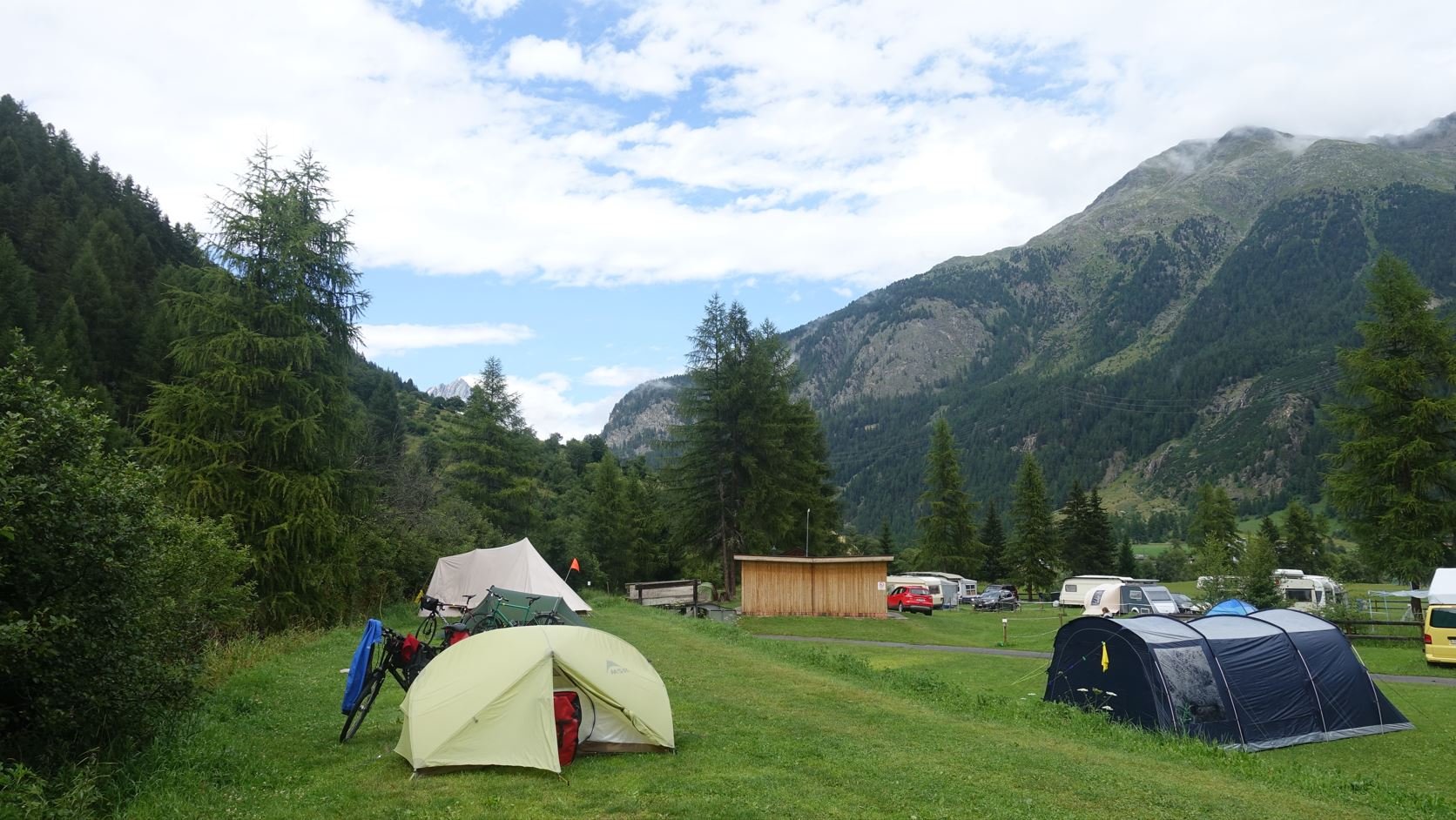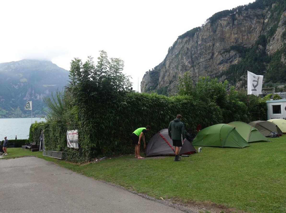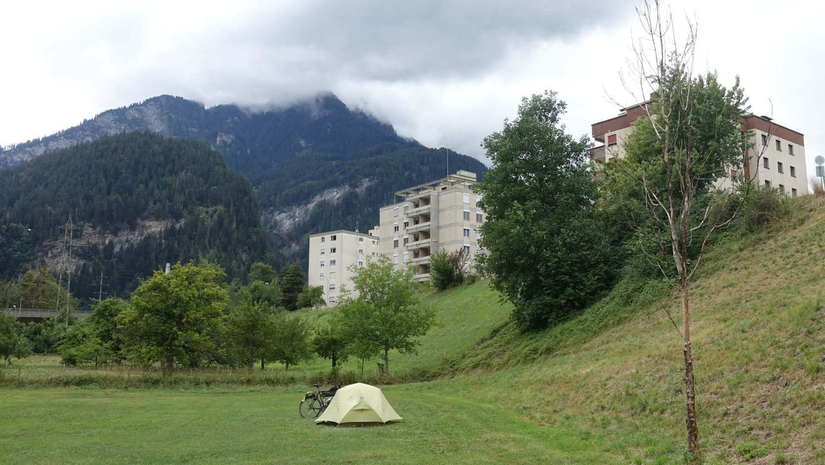 Camping in Thusis was vol maar dat gold bij lange na niet voor het tentenveldje. Daar ook de eerste vakantiefietsers ontmoet, een echtpaar uit Nederland.