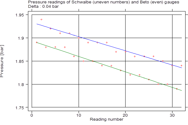 Een vergelijking tussen de Schwalbe en de digitale SKS-meter gaf een systematisch verschil van ongeveer 0,03 bar (de SKS drukmeter rond metingen af naar 0,05 bar).