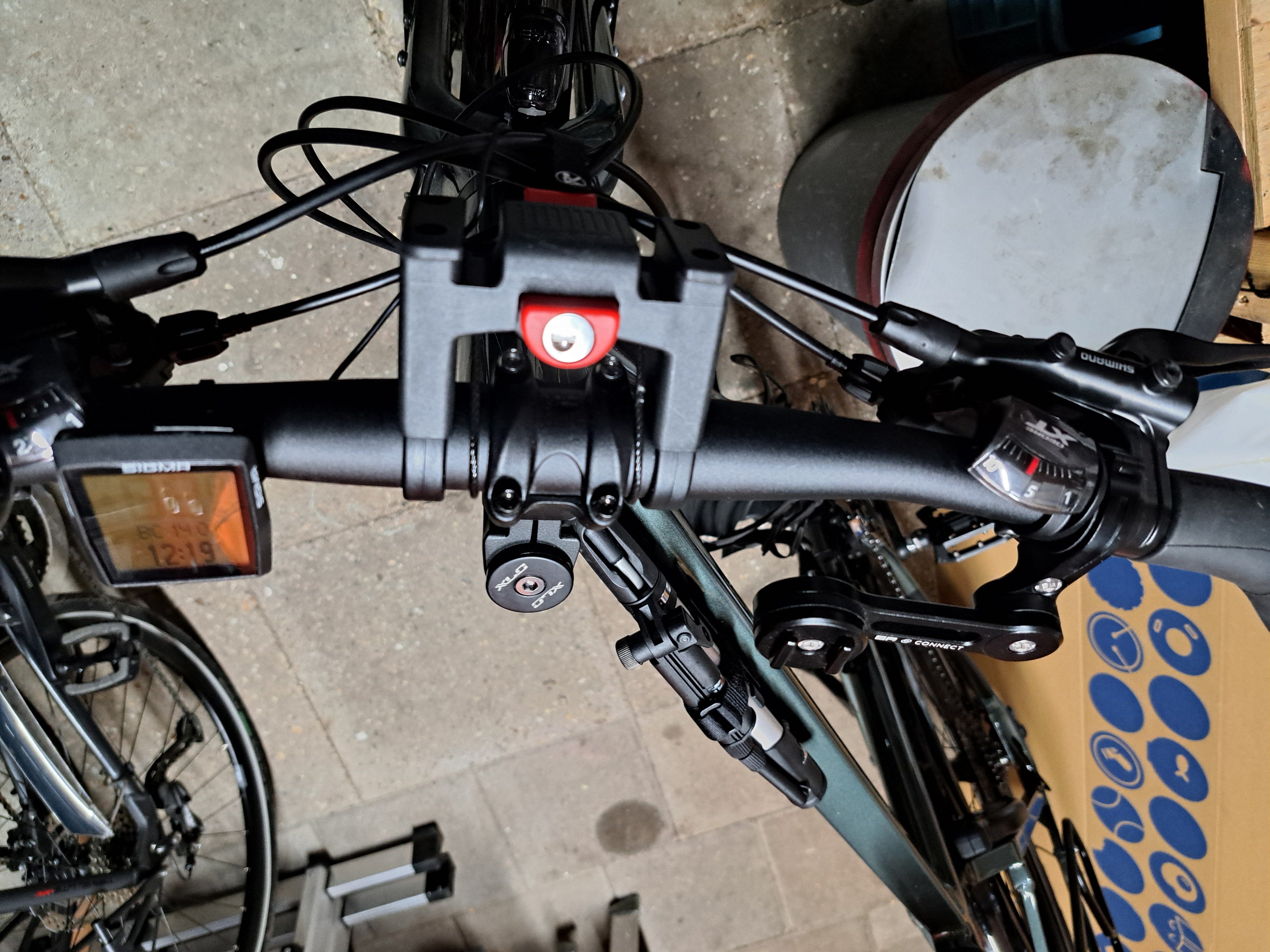 Ik heb de kabel zoals op de foto gemonteerd alleen door de kabelspanning gaat de adapter 30 graden omhoog staan. Als de tas eraan komt dan hangt hij goed (niet stevig ivm het niet klemmen) en als de tas eraf is dan gaat hij weer omhoog staan en rammelt bij het fietsen.