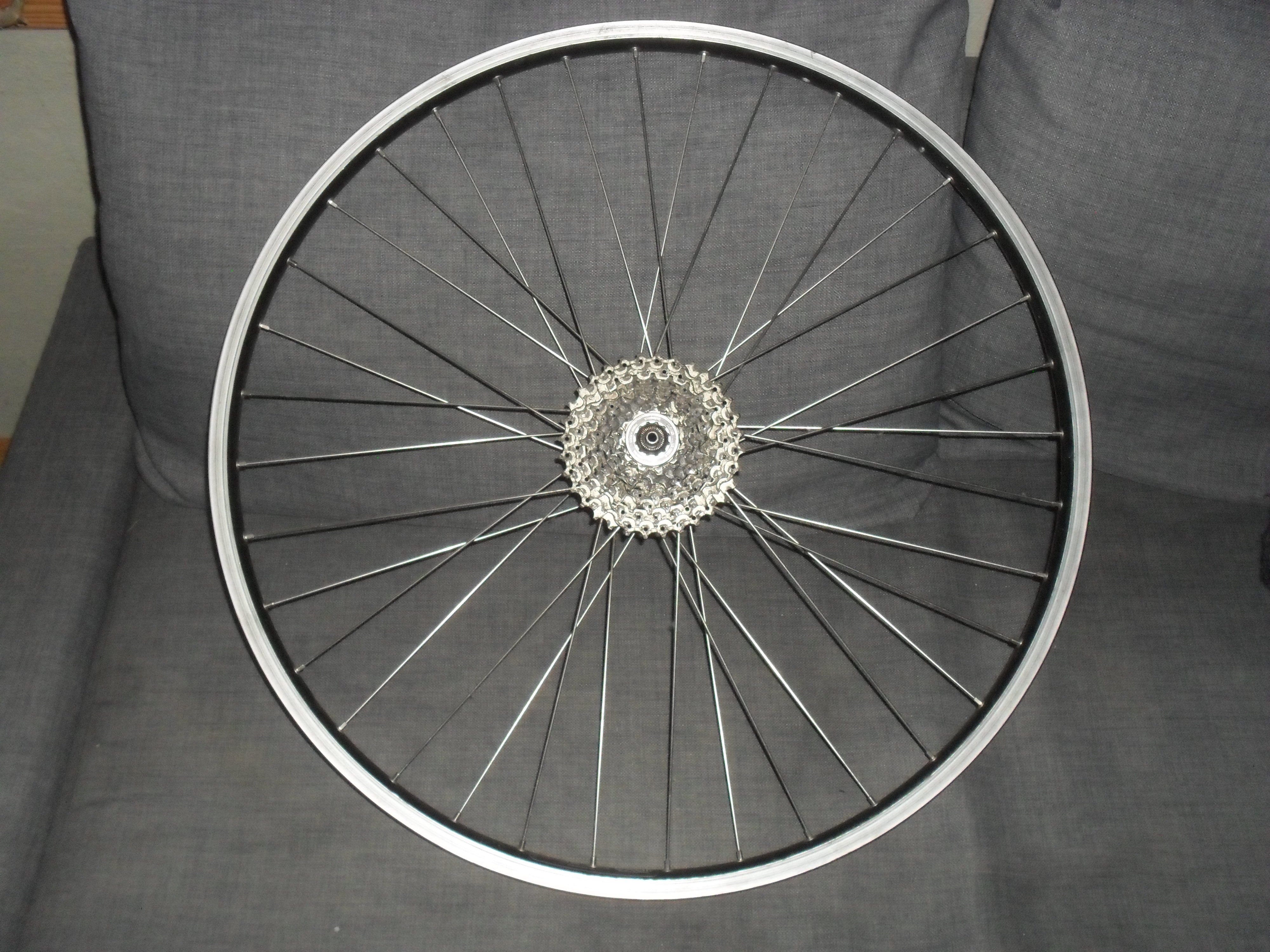Te koop 28 inch achterwiel met 36 spaken. Gemaakt door Snel uit Utrecht. Heeft Excal sp19 velg en Deore naaf en 9 speed cassette.