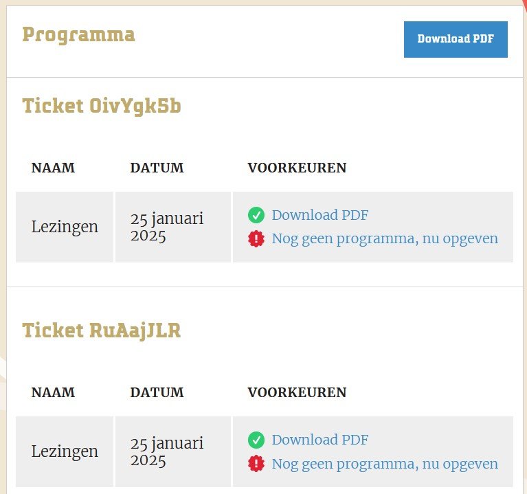 Ik wil 2 kaarten bestellen, maar als ik dan door het menu loop van de lezingen kan ik maar 1x kiezen. Of wordt er vanuit gegaan dat we beide naar dezelfde lezingen willen? Of moet ik dat aangeven op een andere manier. Op de website vind ik hierover geen informatie terug.