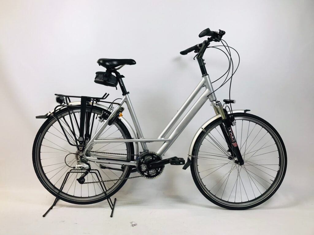 Afgelopen voorjaar bemerkte ik pijn bij het op-en-afstappen van mijn fiets, been over het zadel veroorzaakt pijnscheuten in lies en / of heupgewricht. Mijn rechterheup is vervangen 12 jaar geleden, mijn linkerheup is ernstige slijtage vastgesteld en ik verwacht daar ook een vervanging van het gewricht. Fietsen op mijn Giant Custom Expert Super Lite gaat derhalve sinds 1 maand niet meer en op zoek naar een vervangende fiets met lage instap, vond ik, vlak bij huis in Amsterdam, een Santos Trekking Comfort te koop, in mijn maat (54cm). Een mooie fiets maar uit verkoop gehaald door eigenaresse. Model maakt heel solide indruk door dubbele liggende achtervork en lijkt mij stabiel om met bepakking afdalingen veilig te volbrengen. Mooie fiets, Magura remmen en ook voorvering, dat laatste minder wenselijk maar 'uit' te zetten.