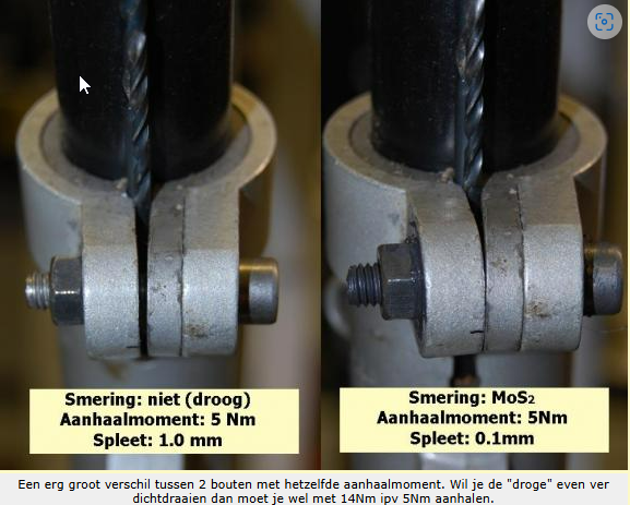 Op bijvoorbeeld mijn zadelklem staat een aanhaalmoment van 5 Nm. Is dat met of zonder het gebruik van montagevet? In welke mate beïnvloed montagevet het eindresultaat? Zeker op het eind (als schroefdraad onder spanning komt) is het verschil tussen met of zonder montagepasta goed voelbaar. Om maar niet te spreken over de invloed in geval van een schroefdraad die aan enige slijtage onderhevig is (en dus extra frictie veroorzaakt).